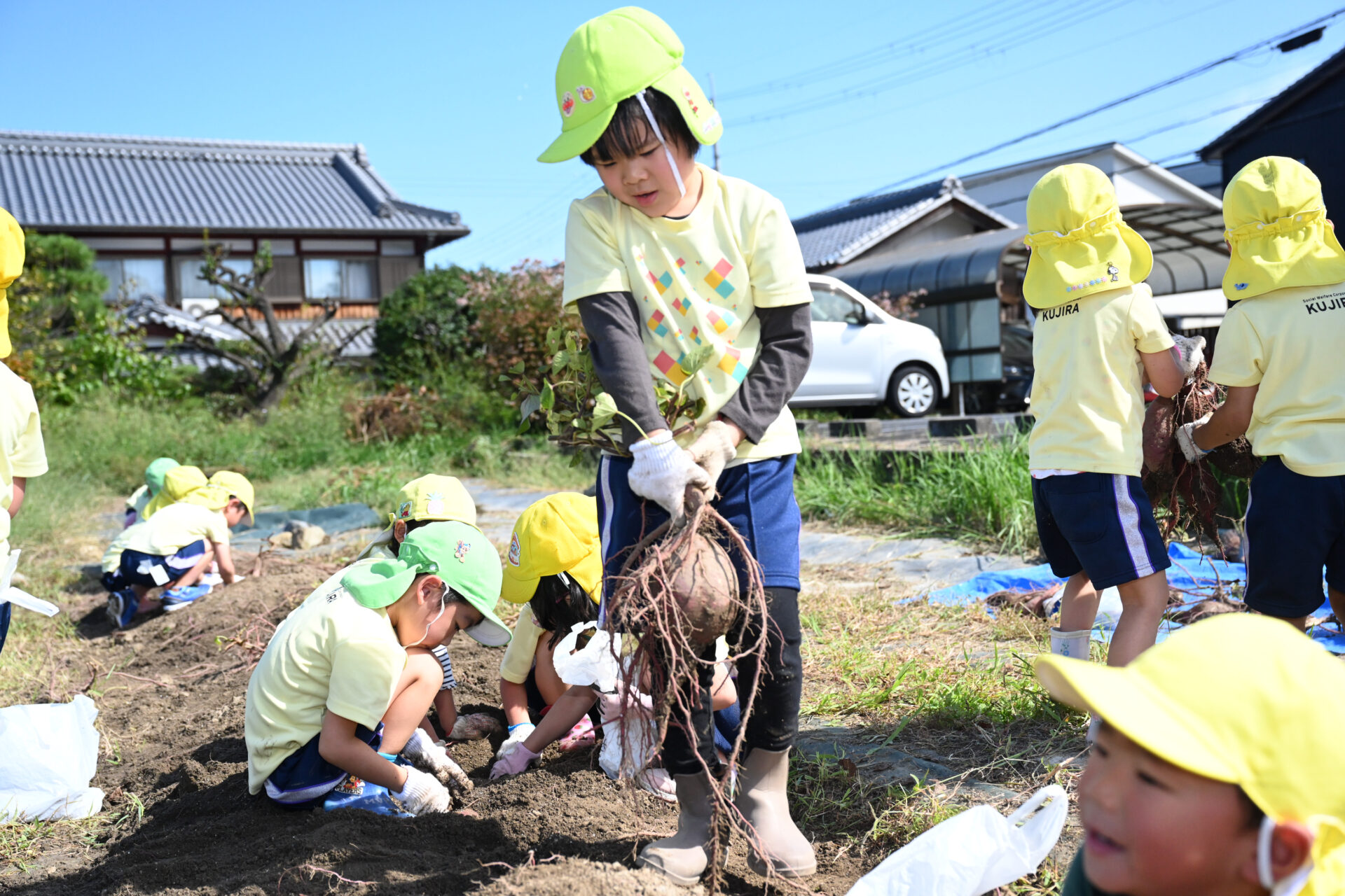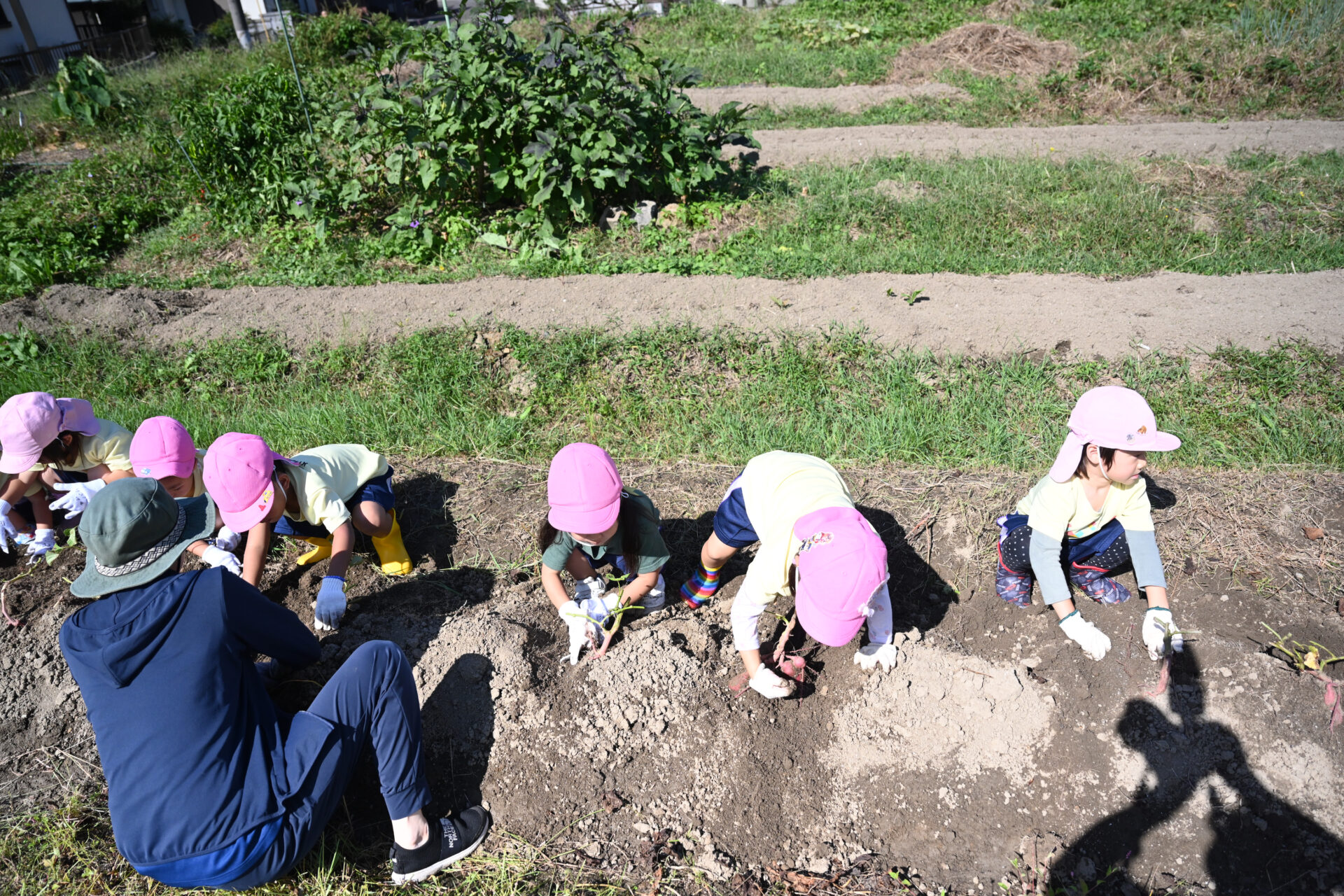 「大きいお芋出てきた!」「いっぱい繋がってる!?」とお話しながら、掘り進める子どもたち。