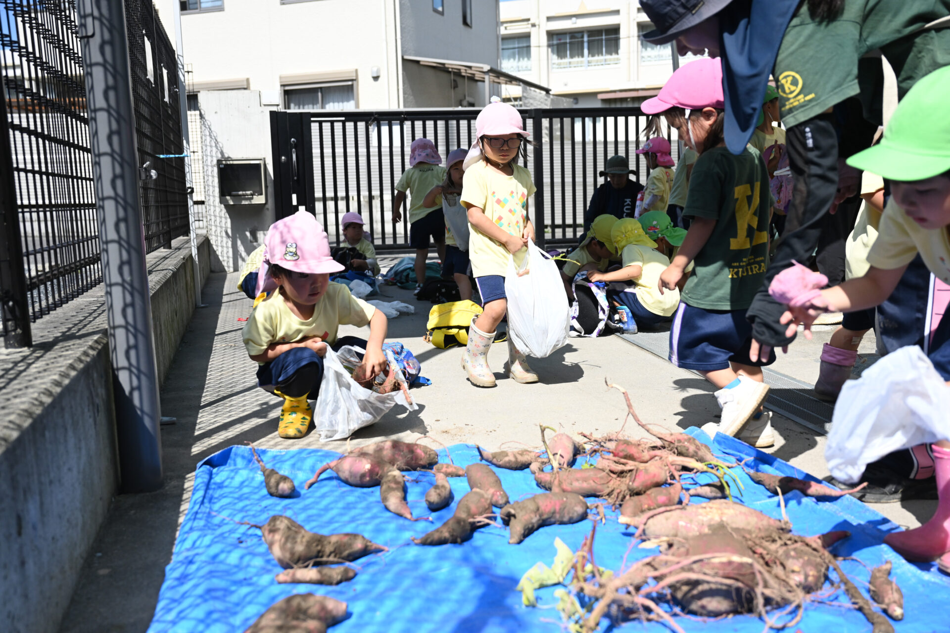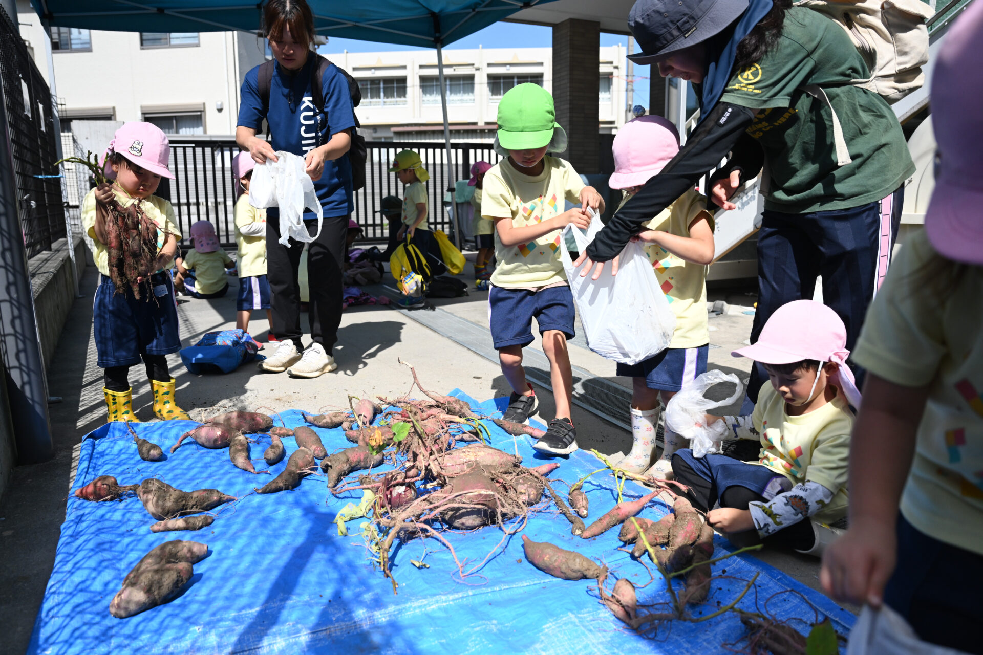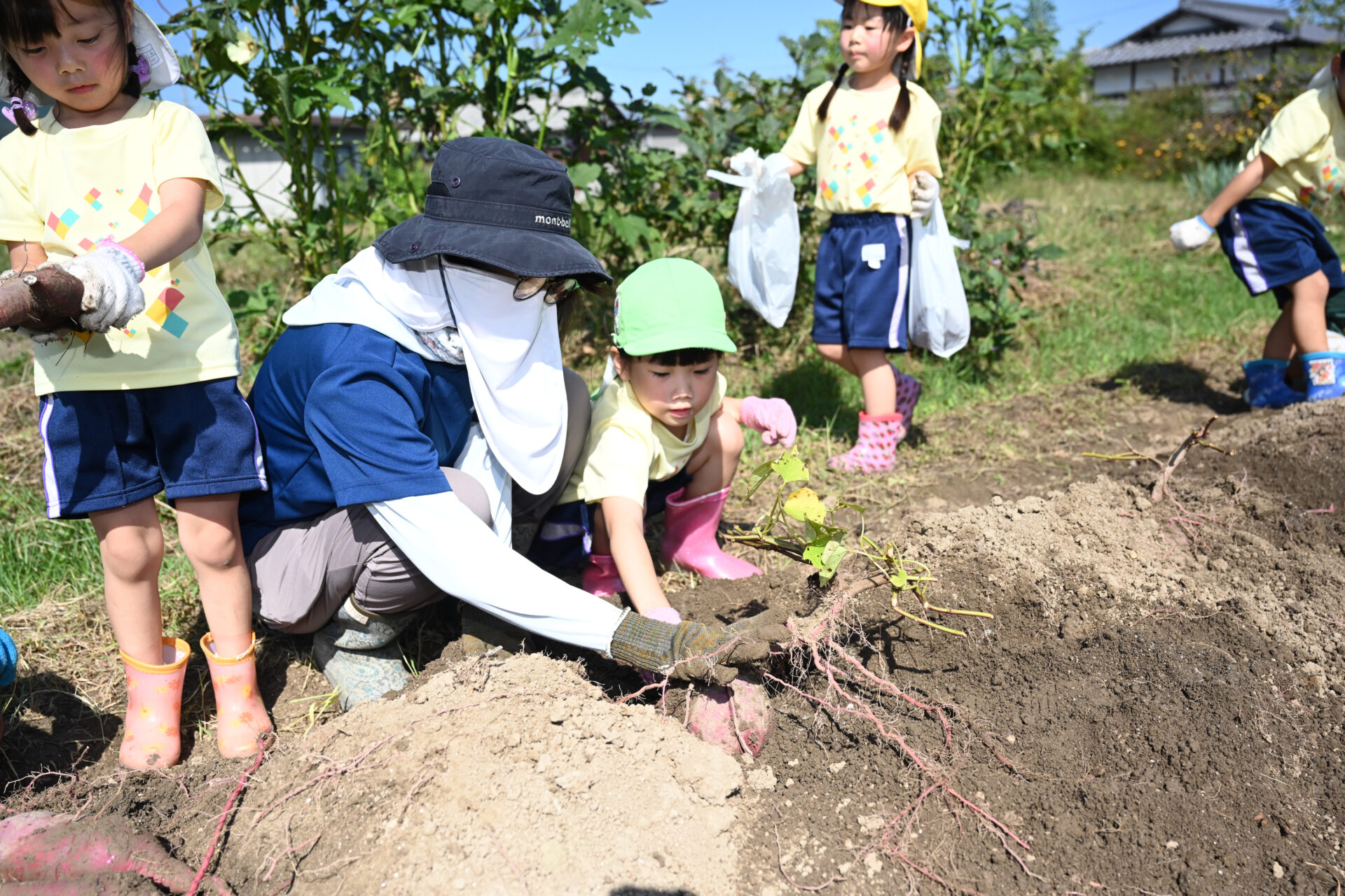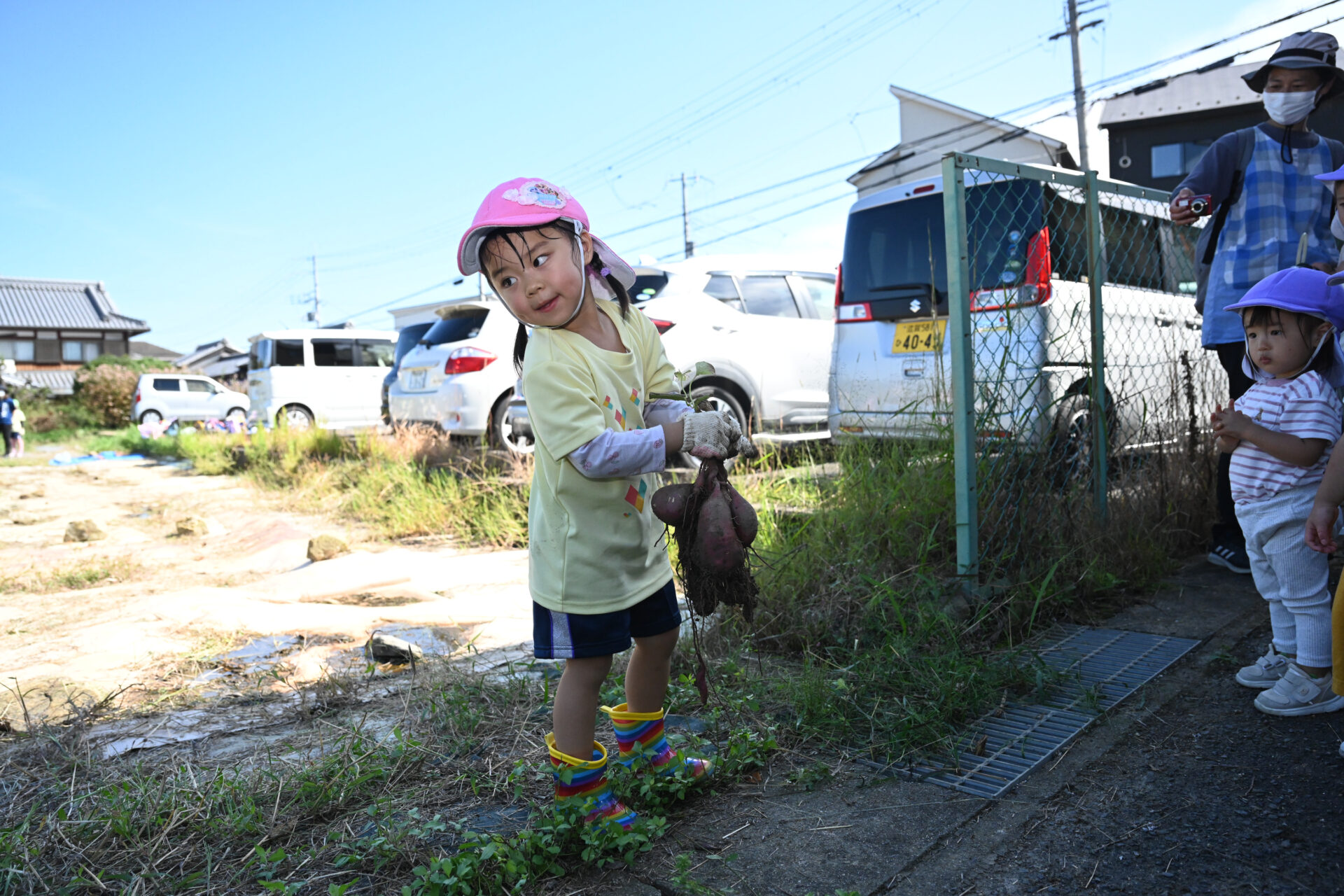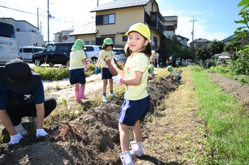 「大きいお芋出てきた!」「いっぱい繋がってる!?」とお話しながら、掘り進める子どもたち。