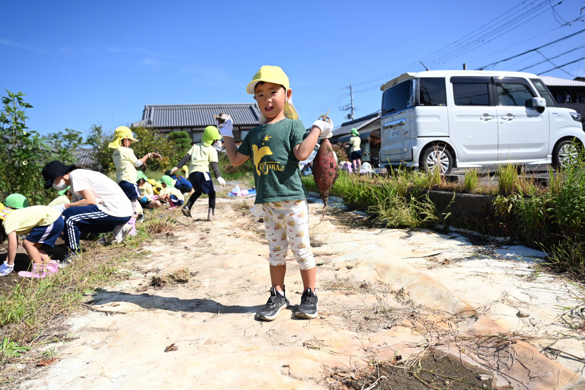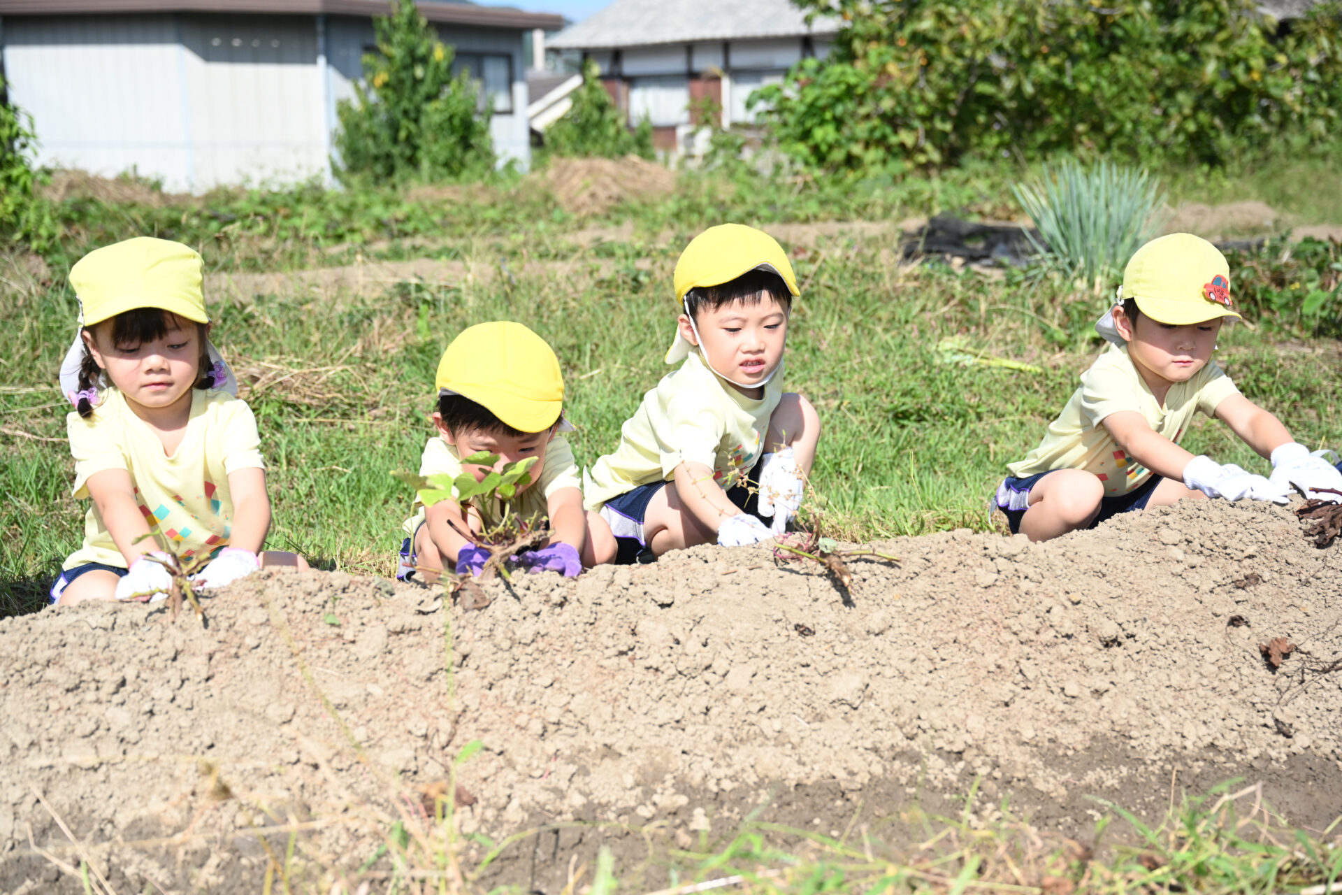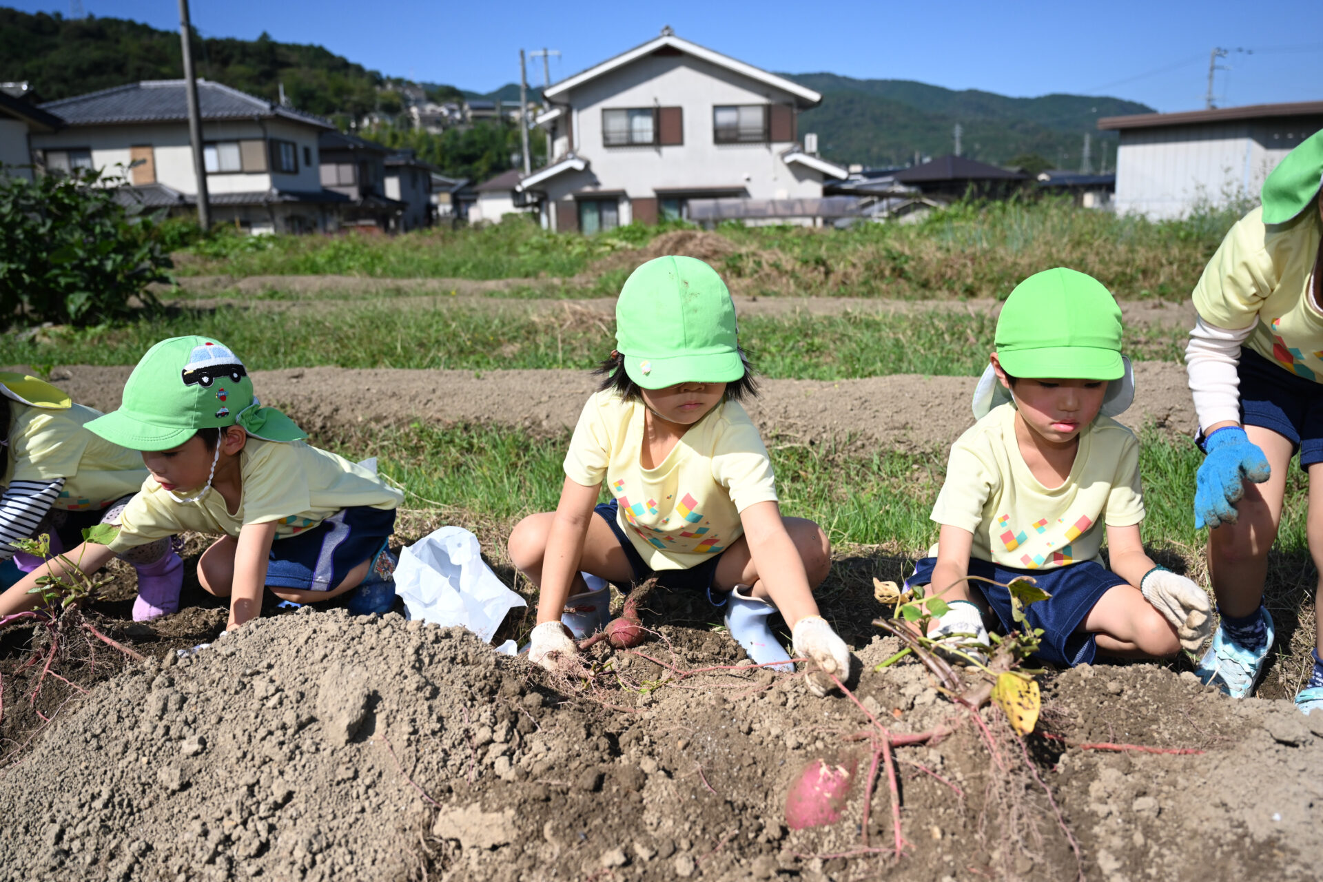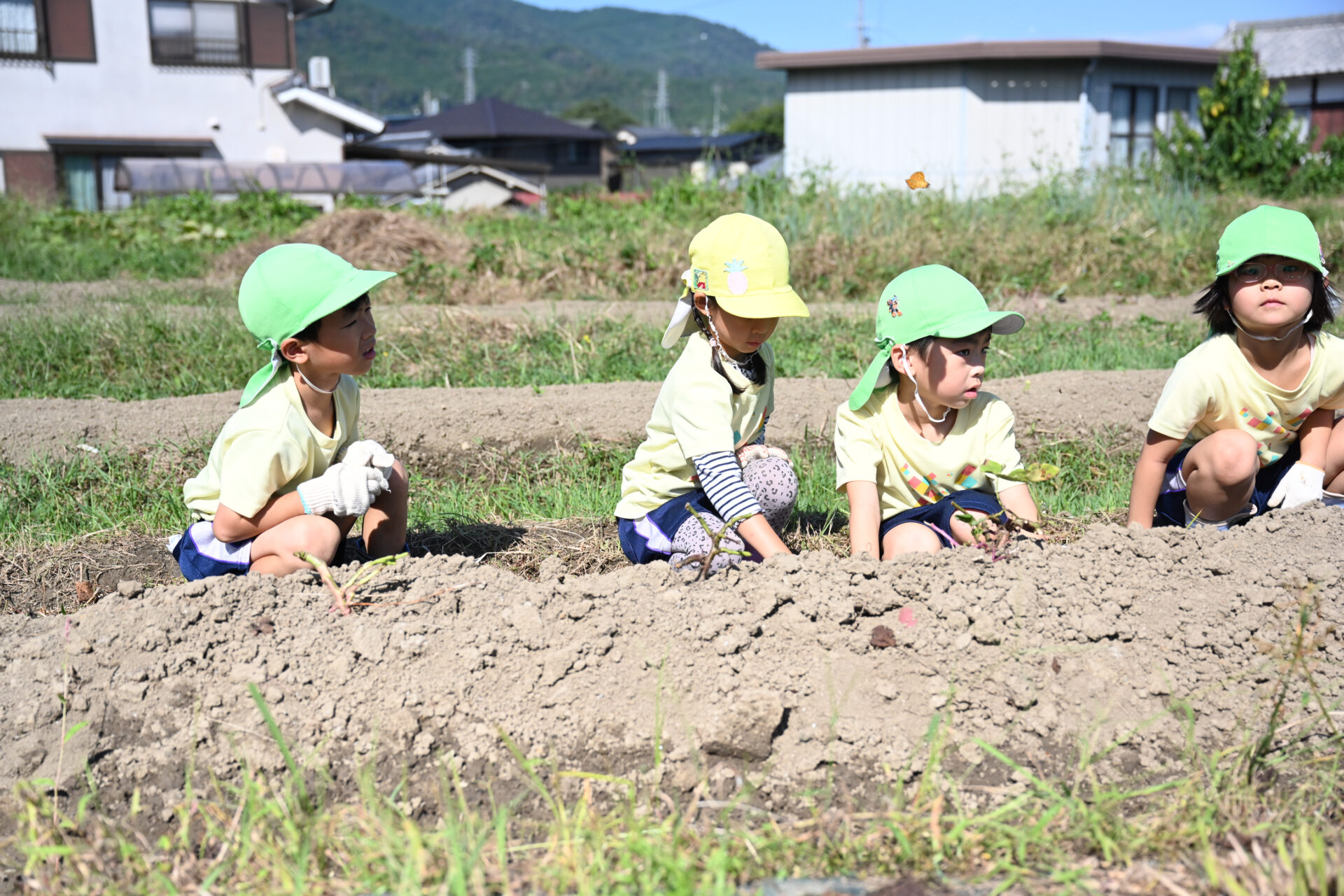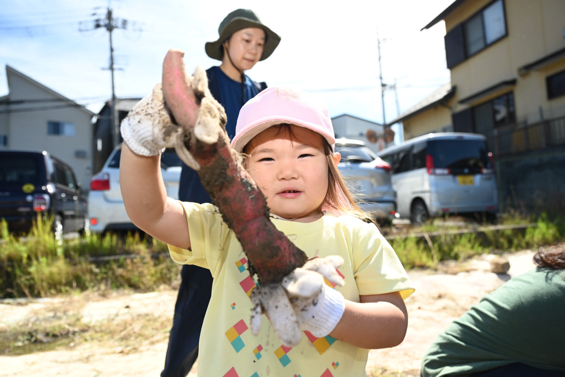 「大きいお芋出てきた!」「いっぱい繋がってる!?」とお話しながら、掘り進める子どもたち。