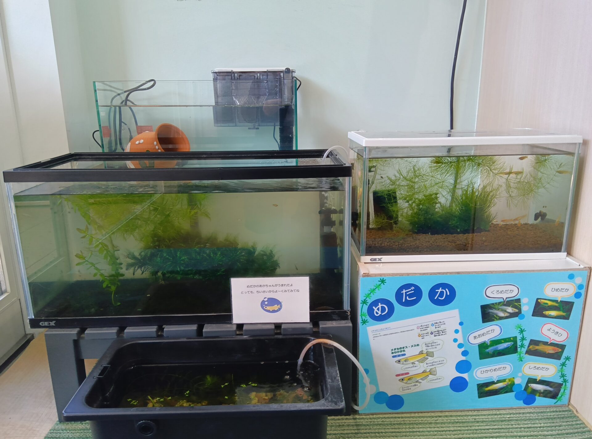 先住者のメダカちゃんと共に、石山くじらミニ水族館のお披露目です。