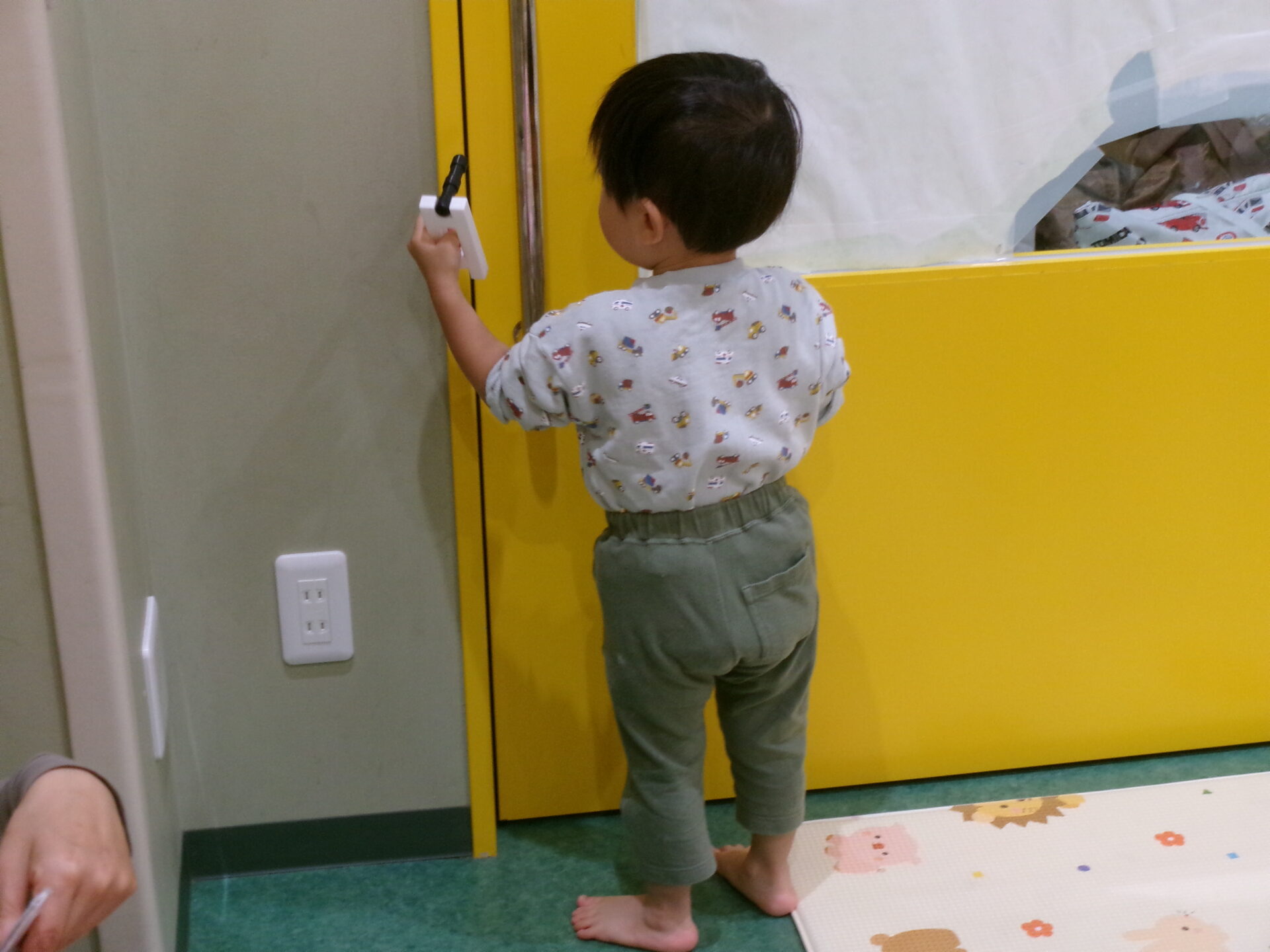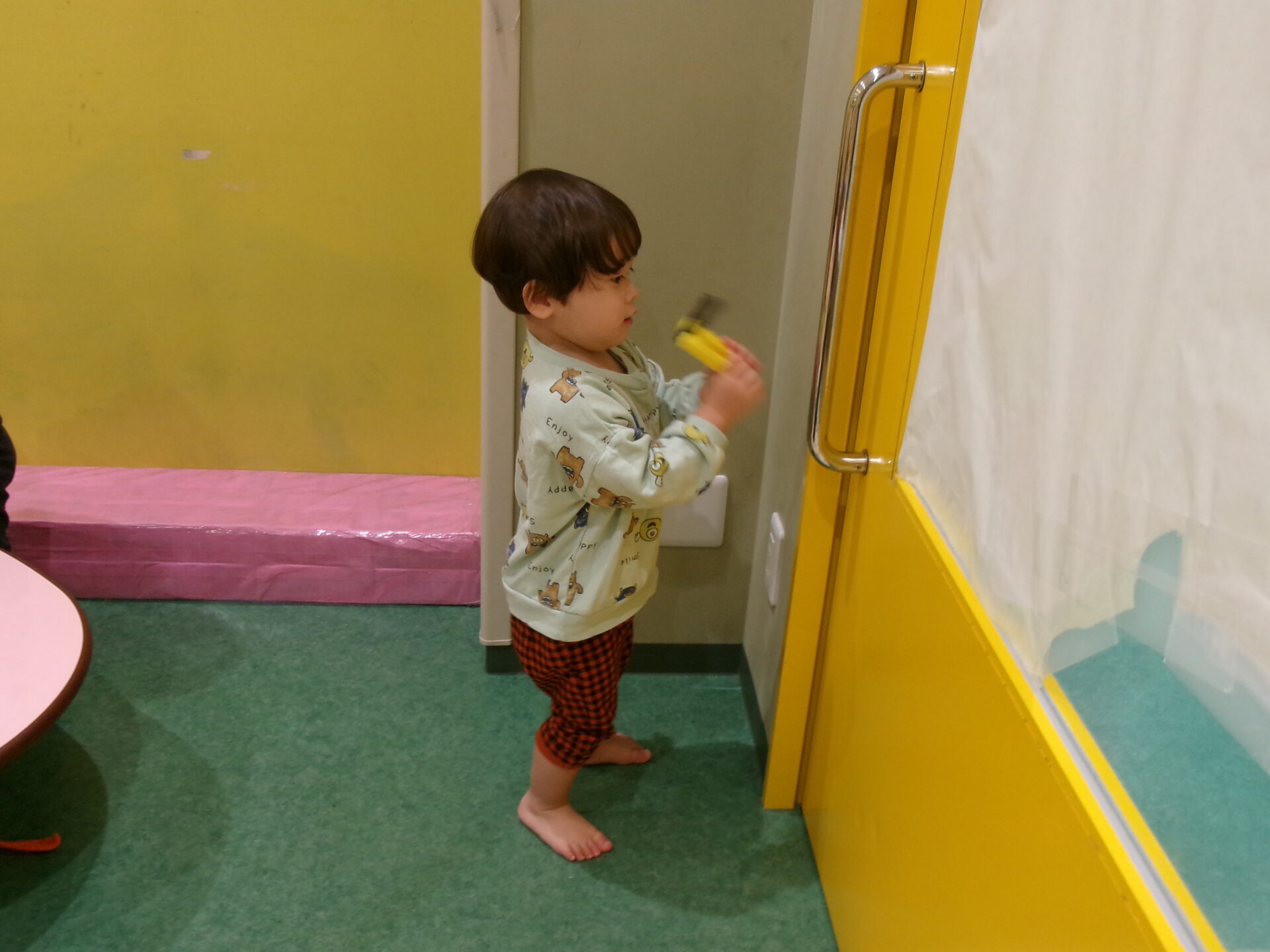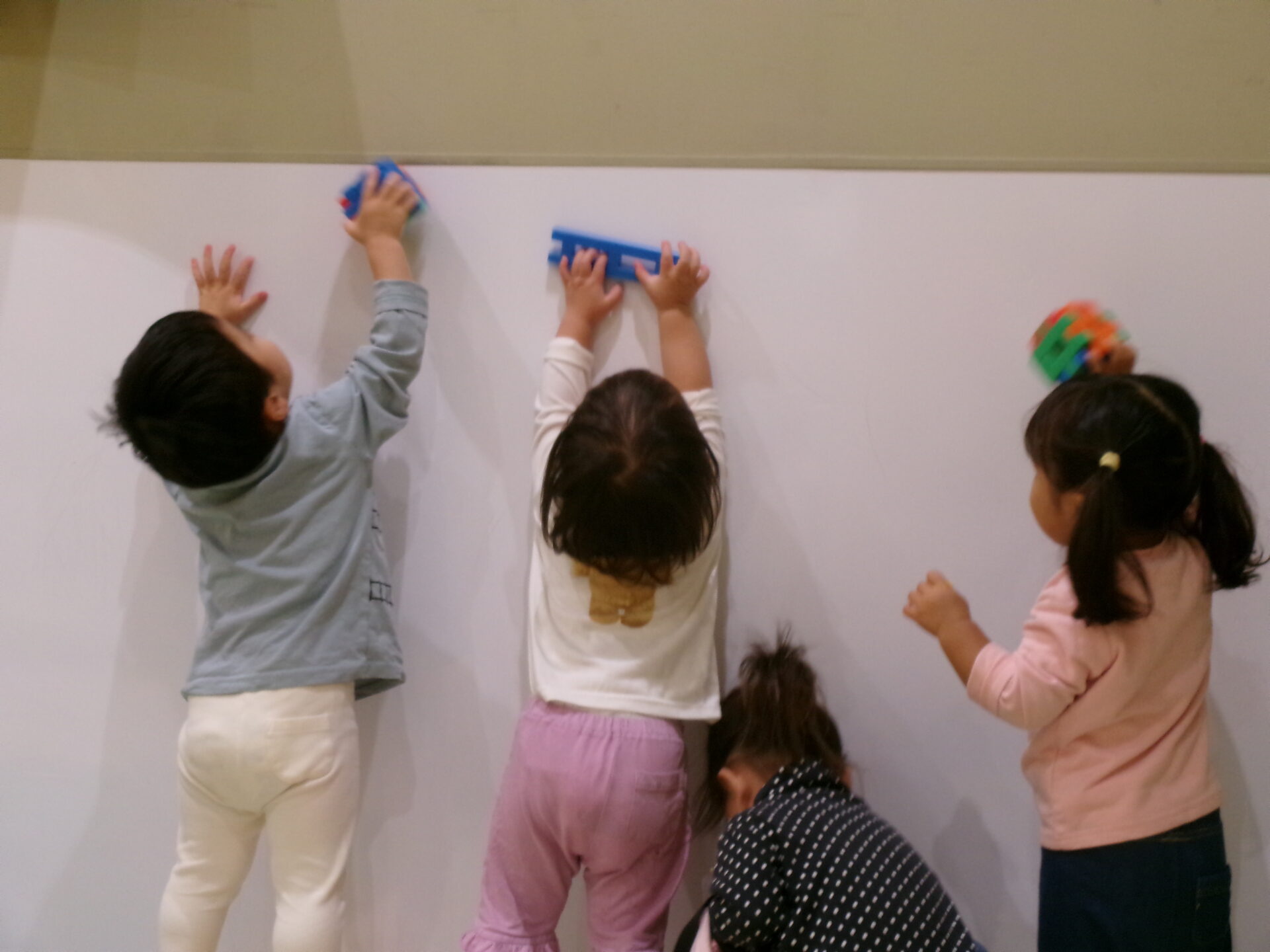 そんなある日、ブロックをT字に組み合わせたもので、保育室のガラスをトントン・拭き拭き、何やら作業中の子どもたち。