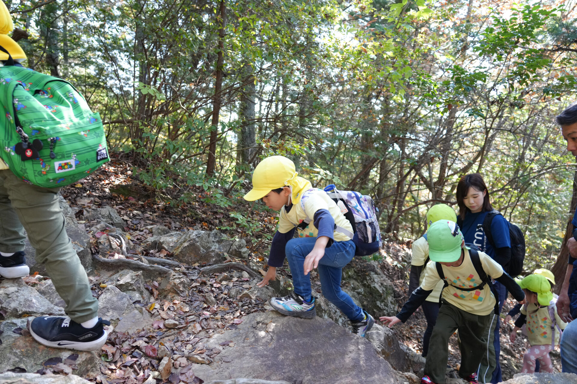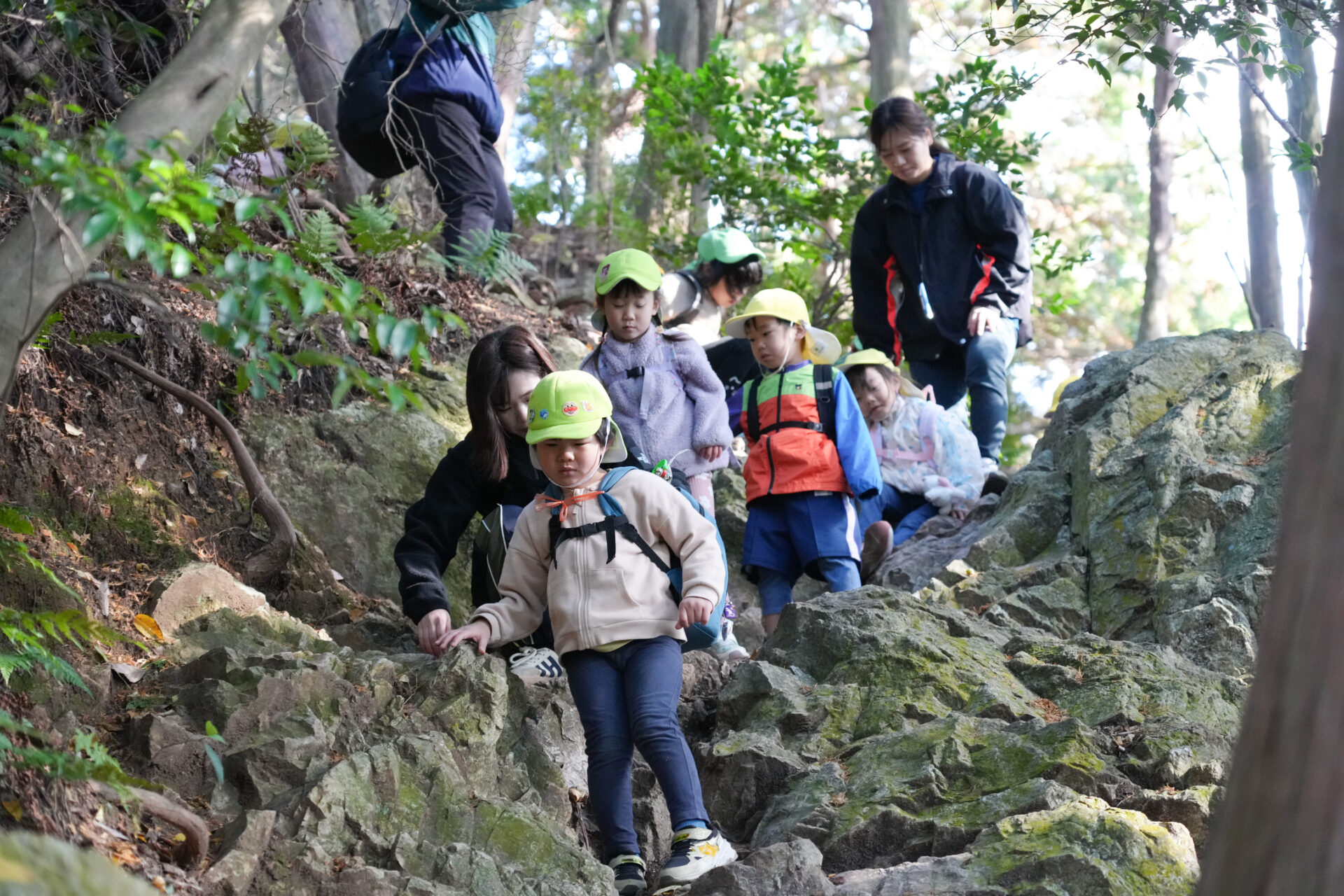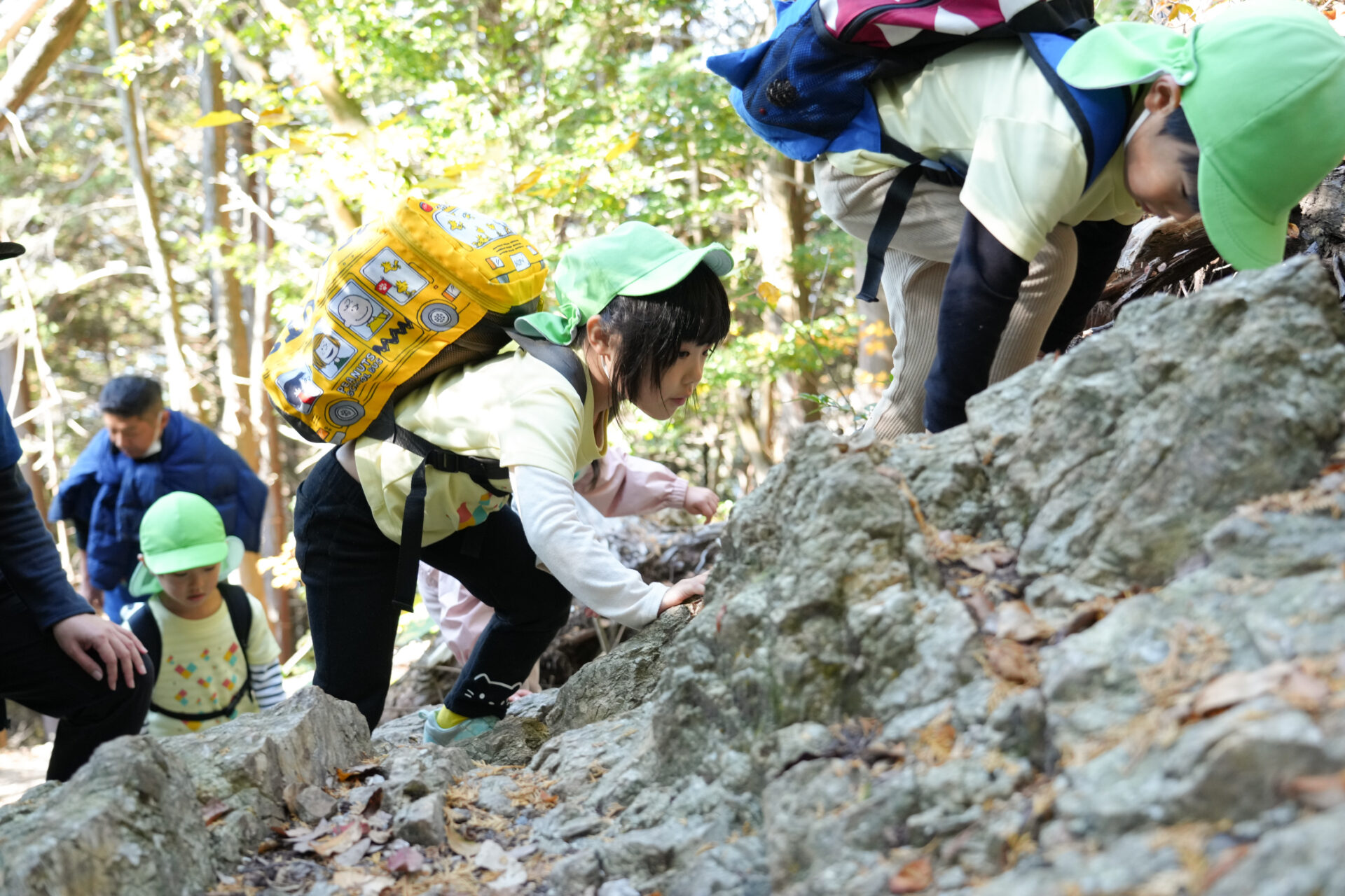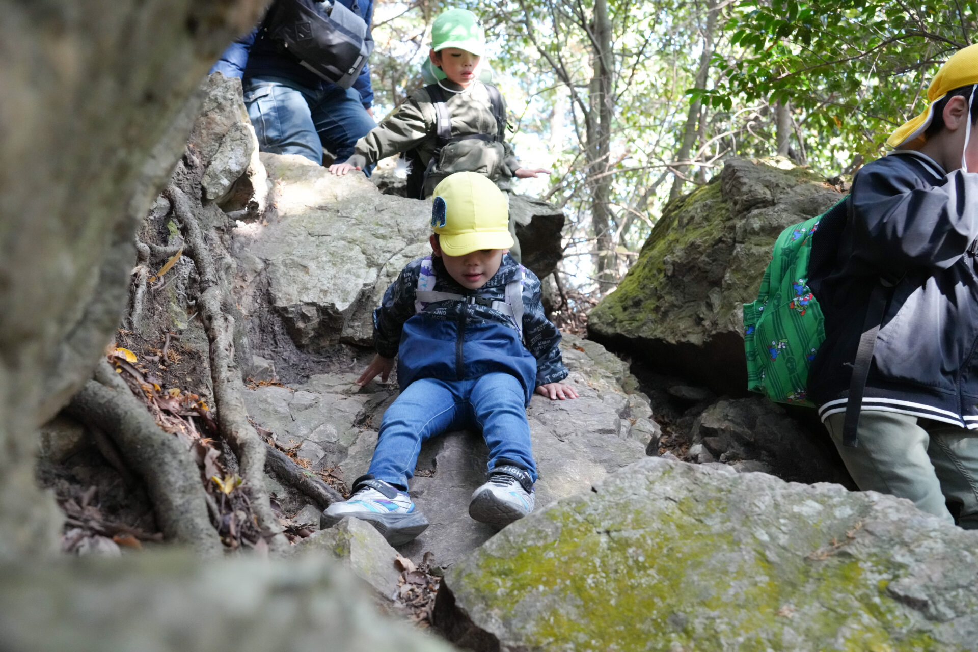 岩場を「よいしょ!よいしょ!」と全身を使って進む子ども達・・・