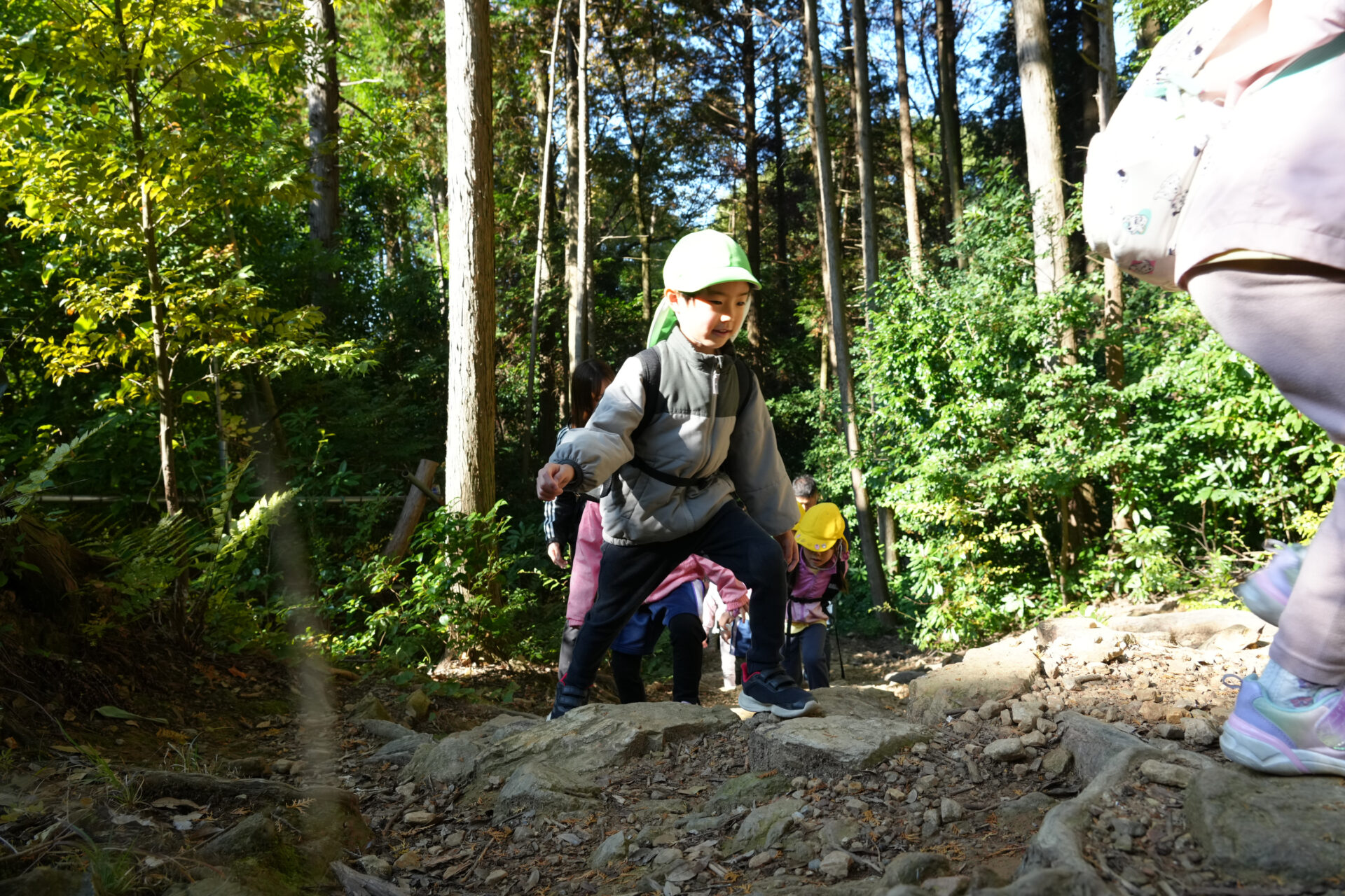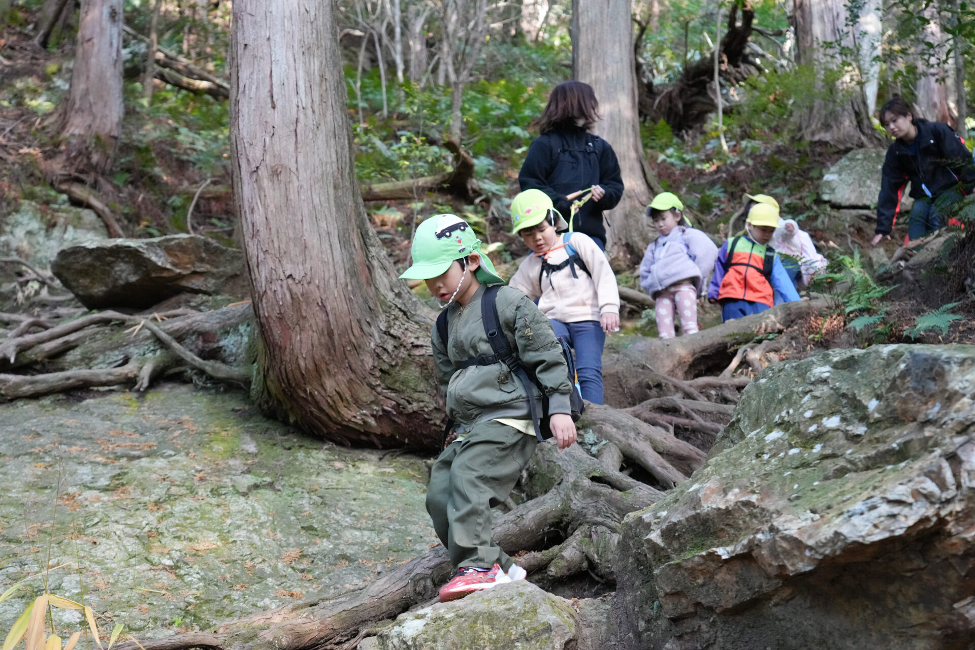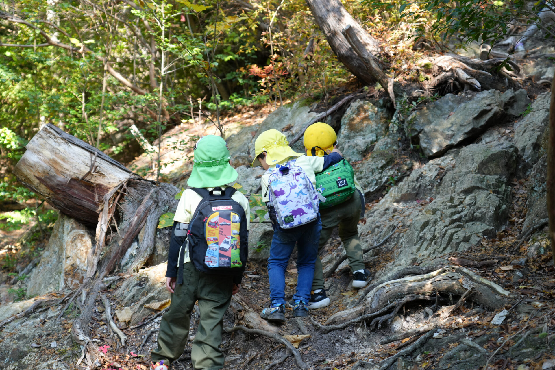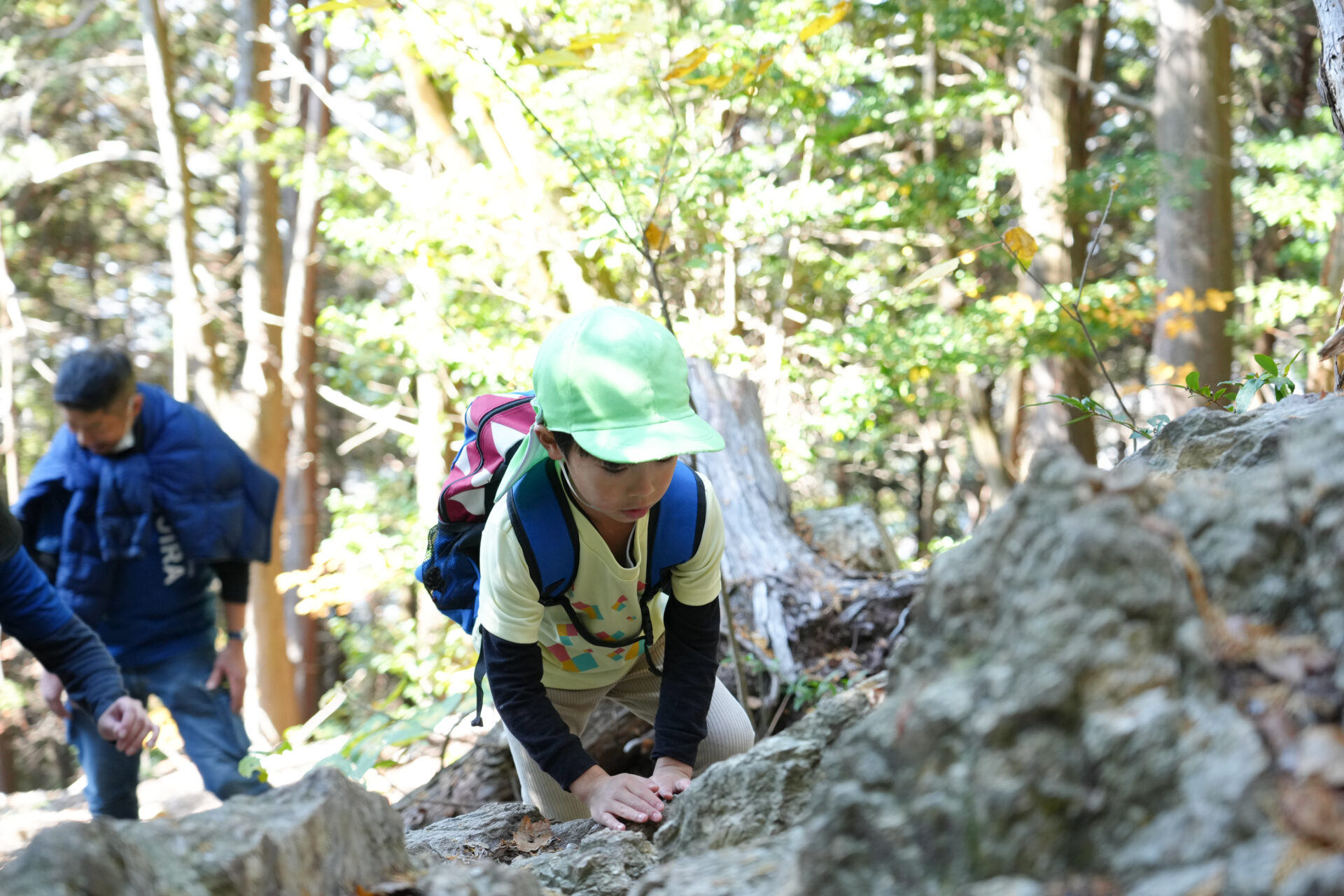 岩場を「よいしょ!よいしょ!」と全身を使って進む子ども達・・・