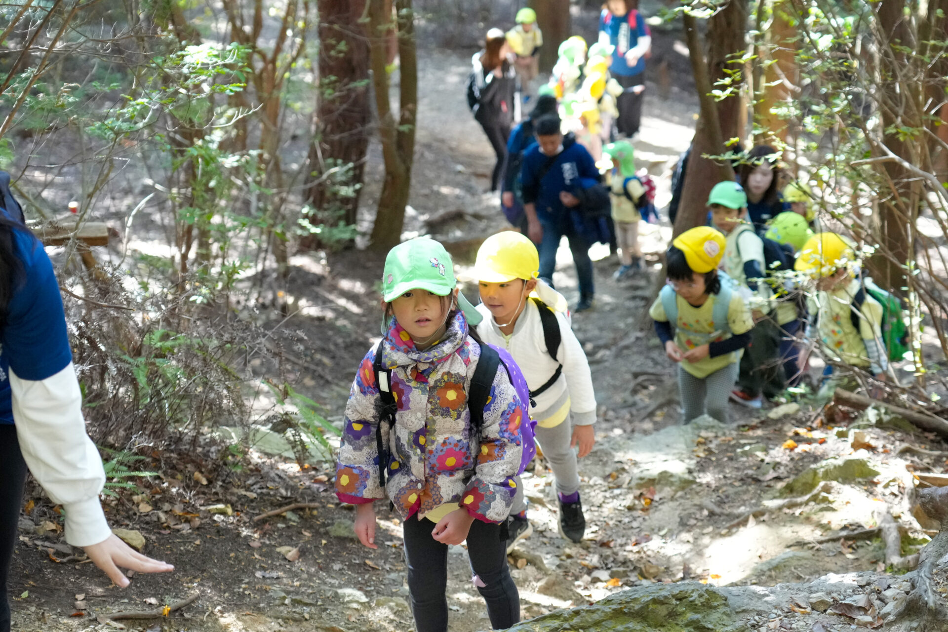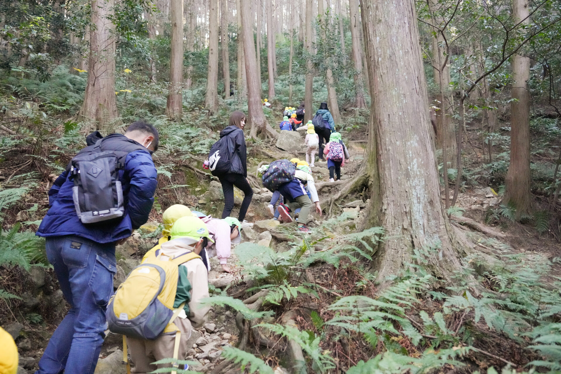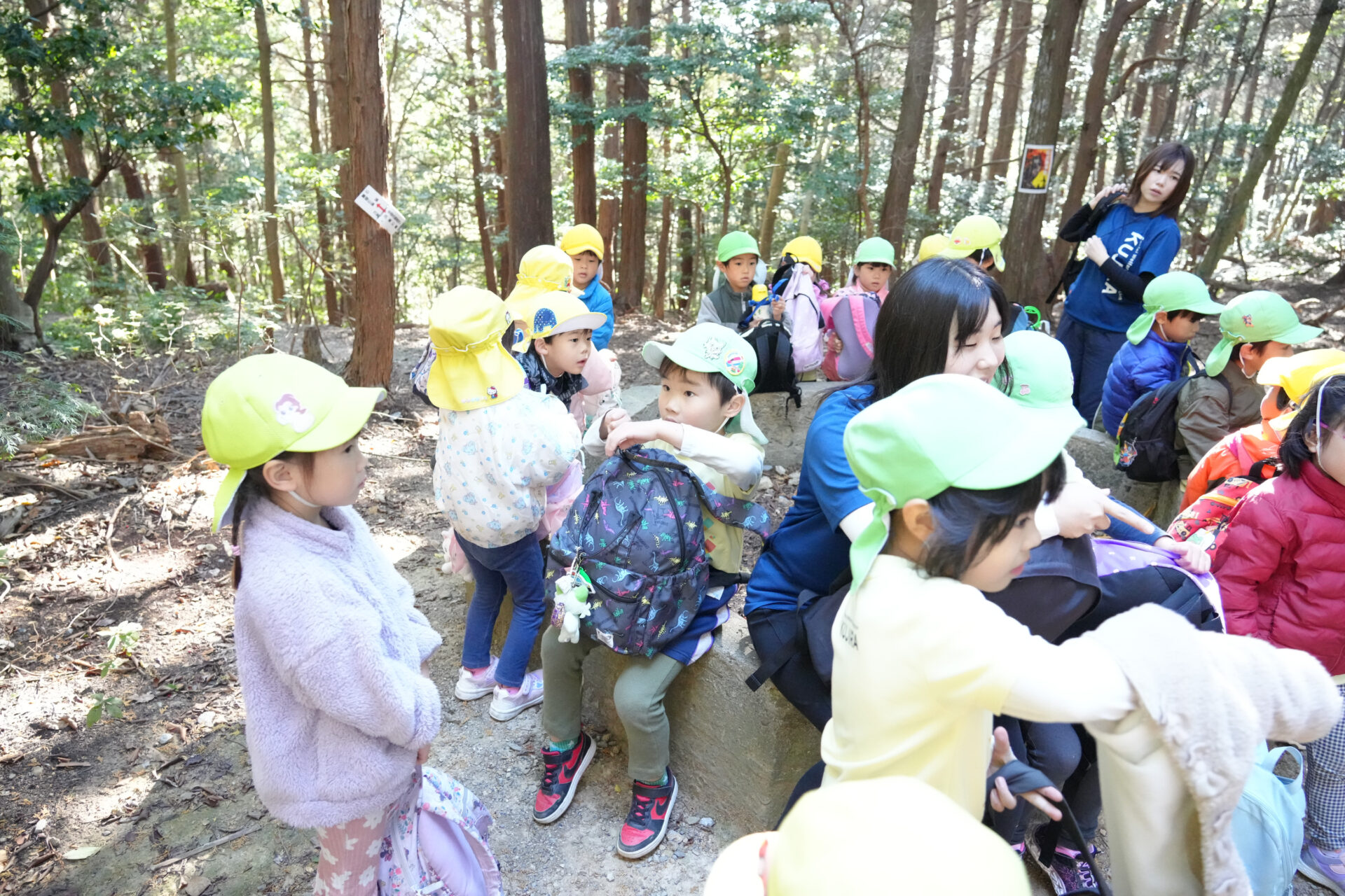 また、本番の三上山登山を想定して、4・5歳児合同でのグループを作り、お互いに声をかけあったり、全員に目が行き届くよう、職員の配置を考えたりしながら、安全に登山ができる工夫もしてきました。