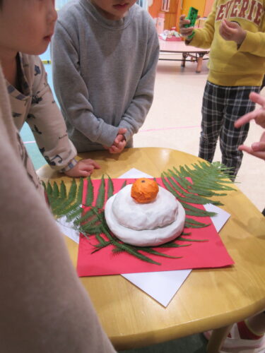 完成したしめ縄・鏡もちは、玄関や各クラスの扉に飾っておきますね♪