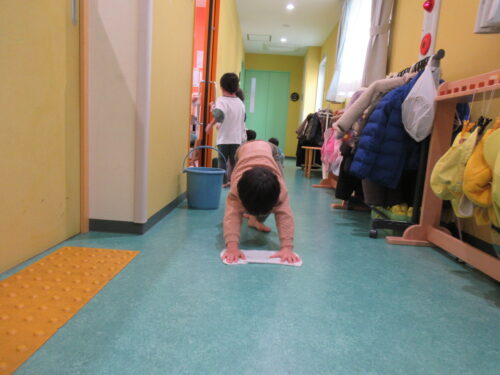 お正月を迎えるのに「くじら保育園にも年神様がきてくれて、みんなのことを見守ってくれるんだよ」と子どもたちに伝えました。大掃除をし、きれいにしてお迎えの準備をすることに・・・