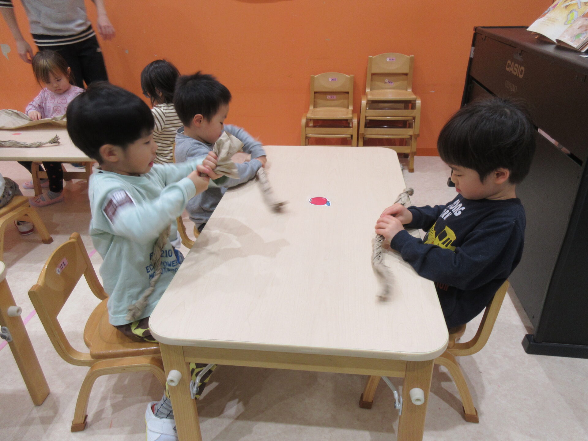 自分のロッカーや靴箱をキレイに拭いて、「おもちゃのとこもキレイにする?」「壁は??」と大張りきりでお掃除をしてくれました♪