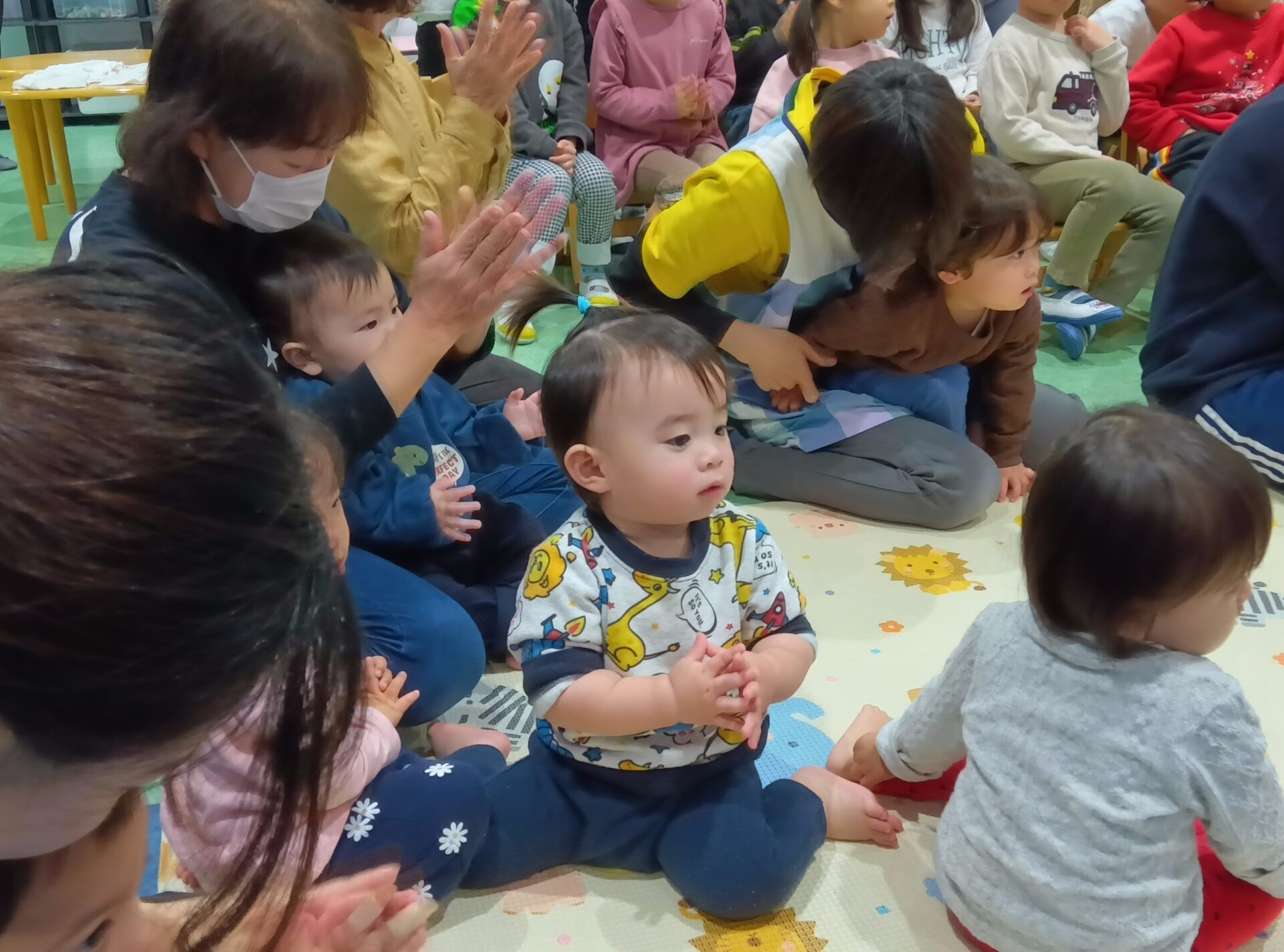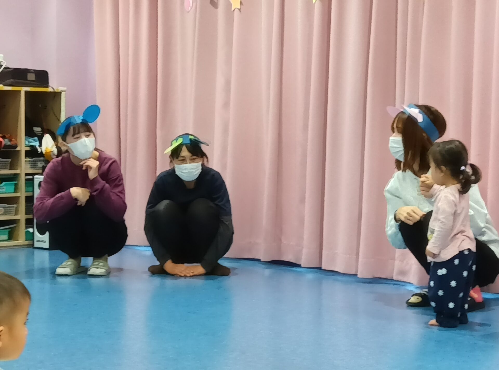 0歳児クラスのお友だちは、担任が劇に参加するとトコトコと後を追い、飛び入り参加もしてくれました。