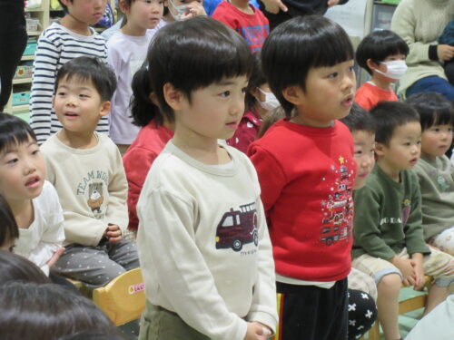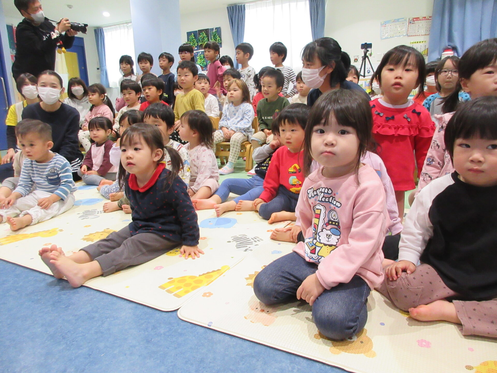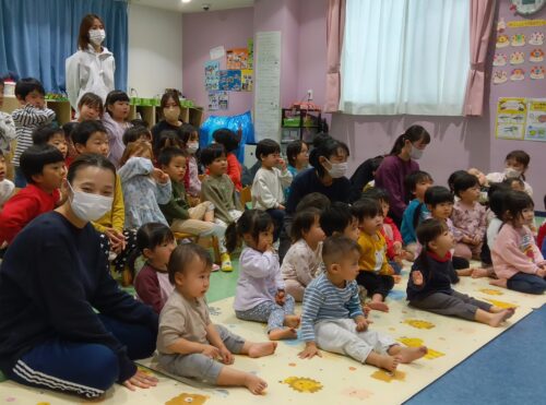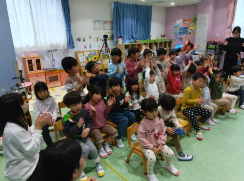 英語でうたってみよう!の声かけがあり、幼児クラスのお友だちは英語の発音をそれっぽく真似、手拍子をしながら大盛り上がりでした。