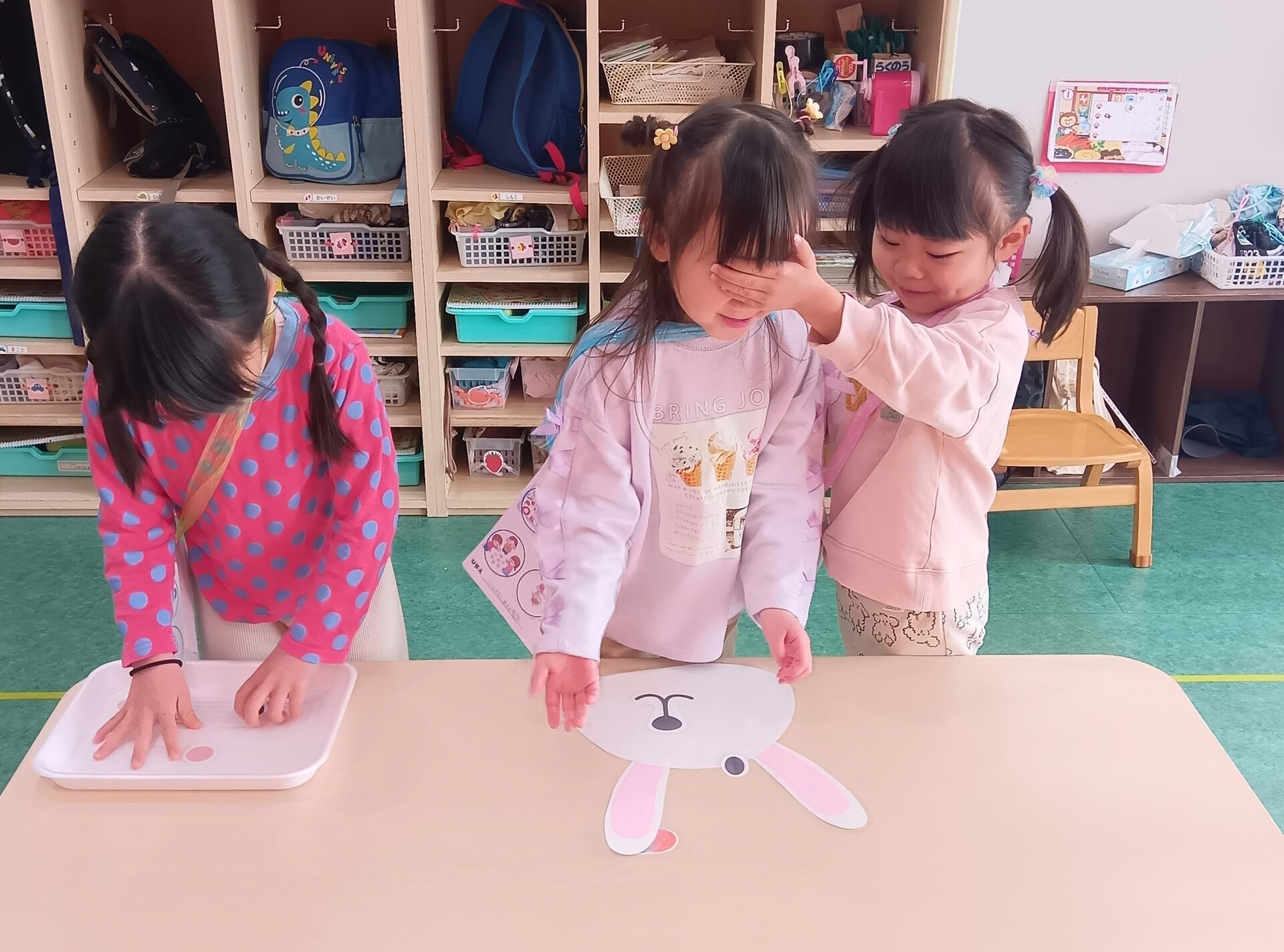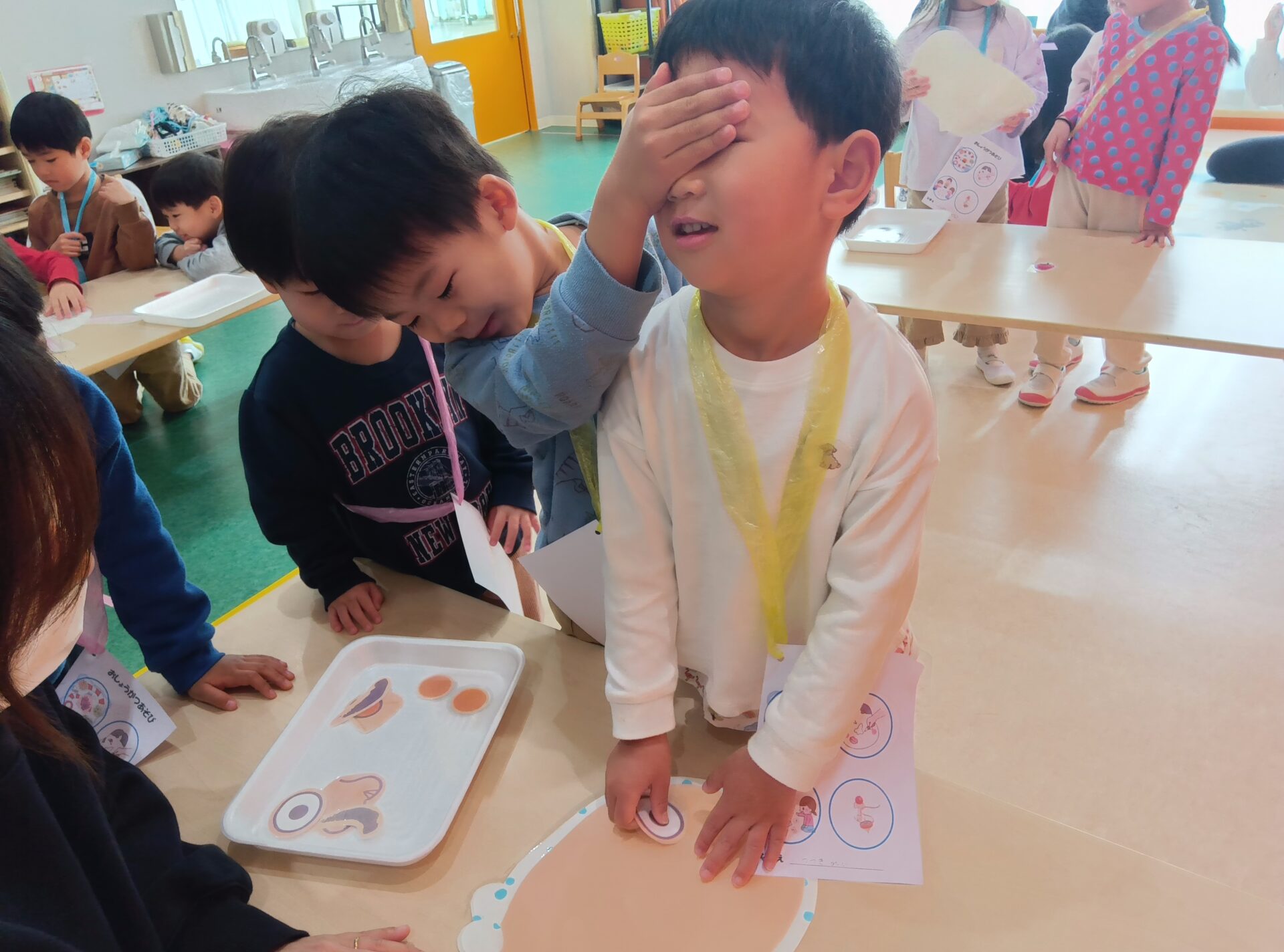 今回は3・4・5歳児1人づつの縦割りグループを作り、一緒にコーナーを回りました。