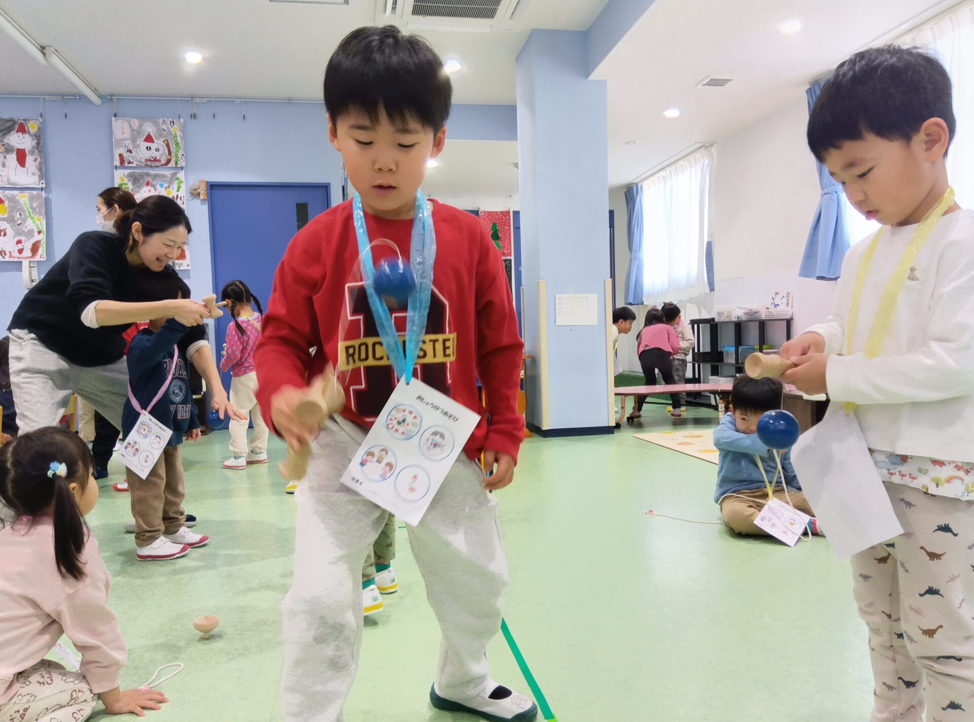 3歳児さんは初めてのお正月遊びでしたが、お兄さん・お姉さんに「こうやってやるんやで~」と教えてもらい、けん玉やかるたにもチャレンジ。賑やかな時間が過ごせました😊