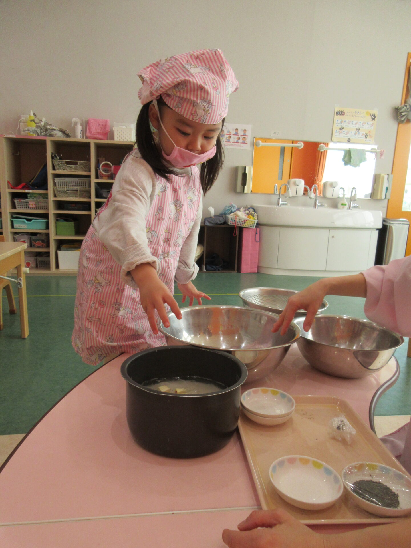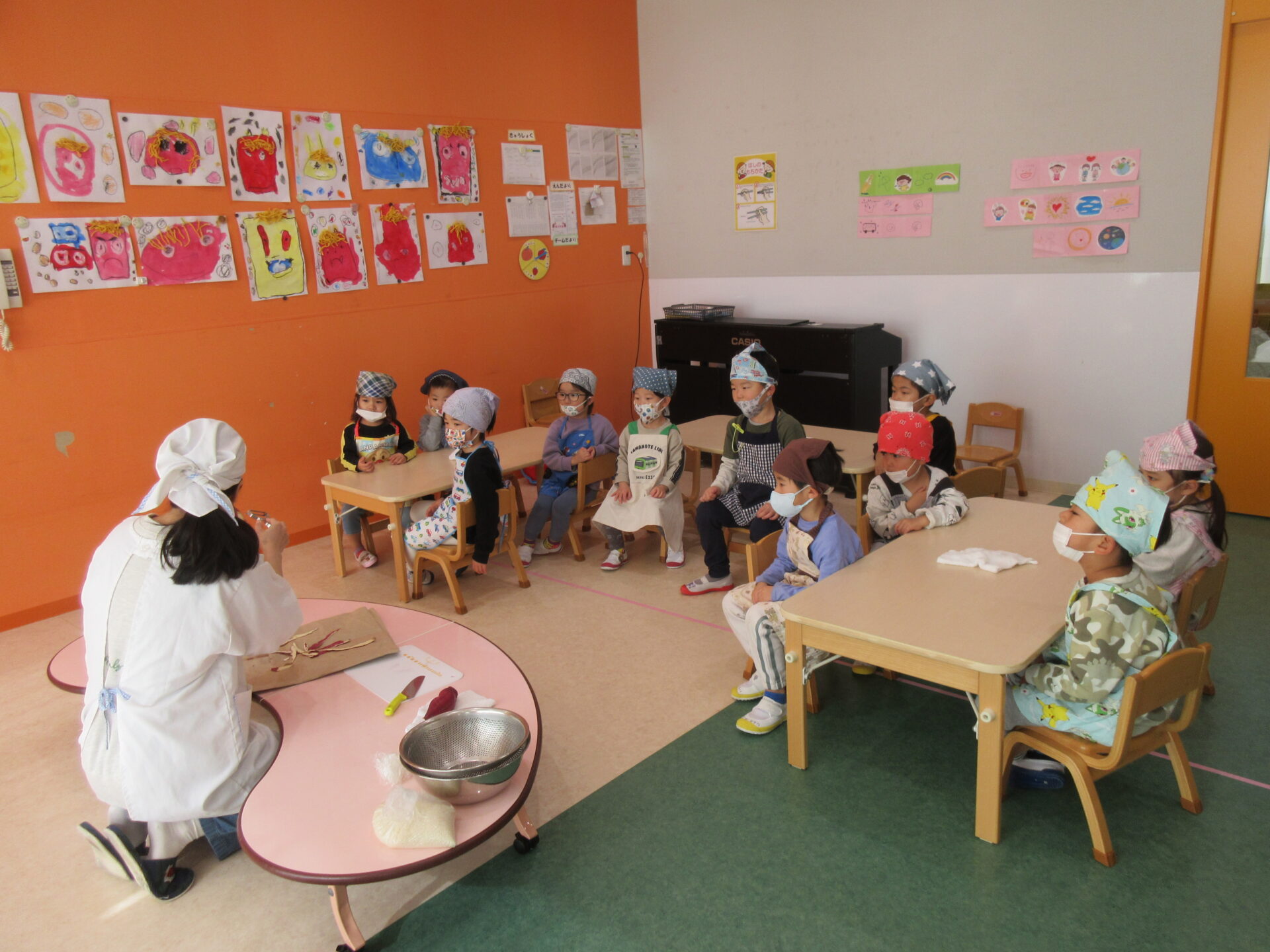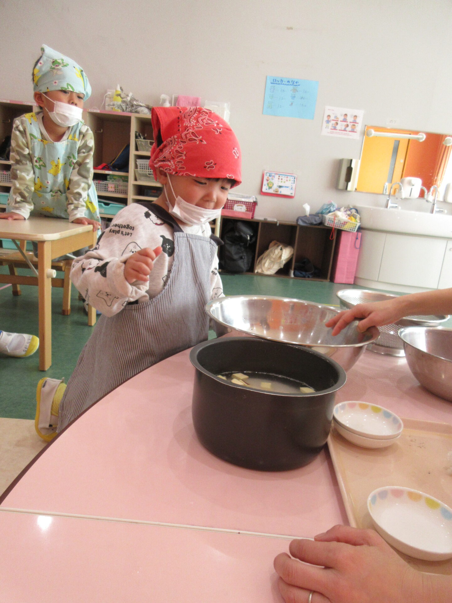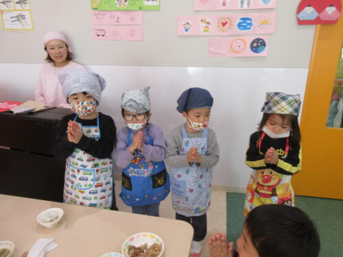 この日はお部屋で制作遊びをして過ごしていたのですが、「なんかいい匂いしてきたー!!」と子ども達のワクワクが止まりませんでした♪