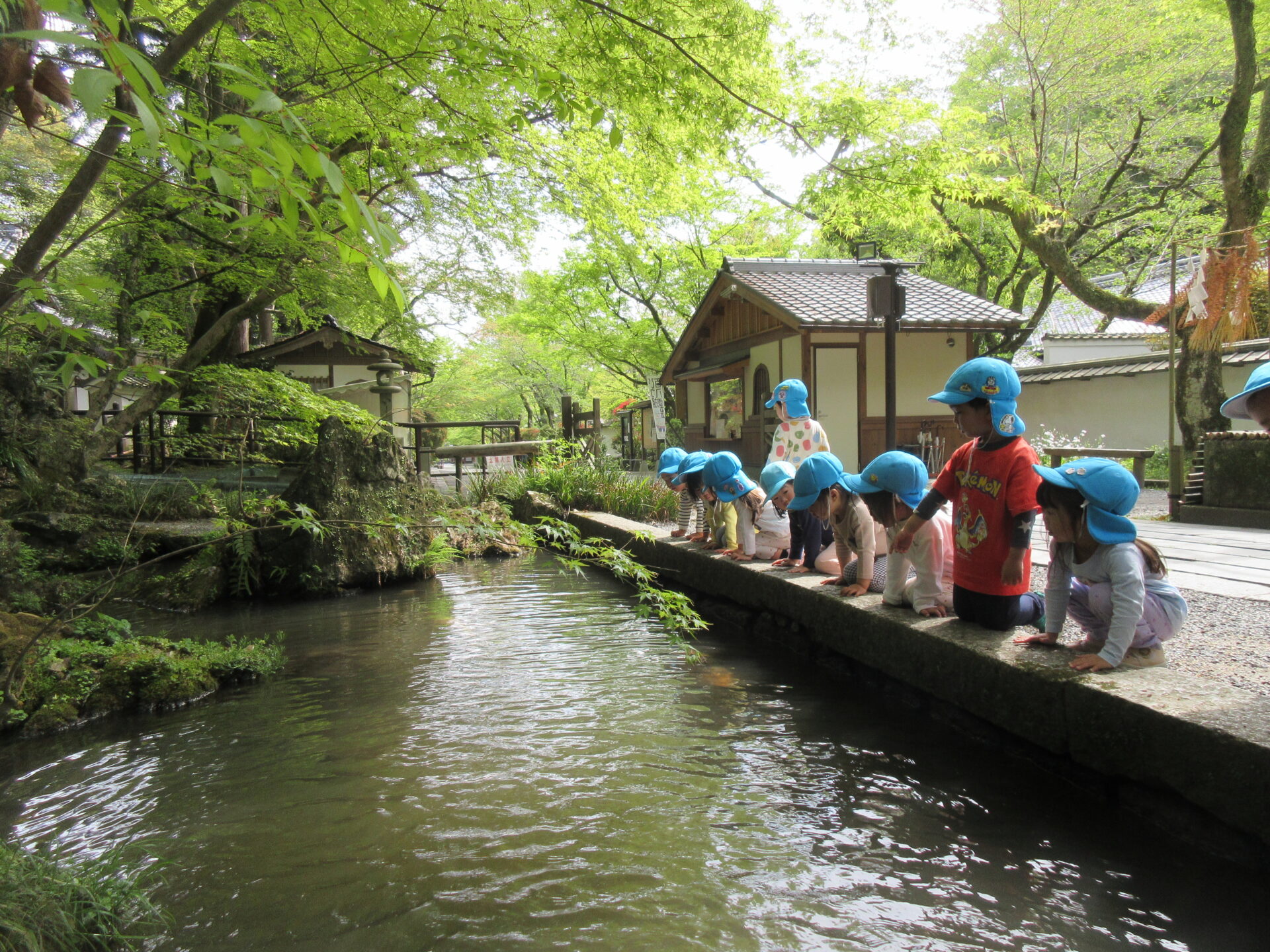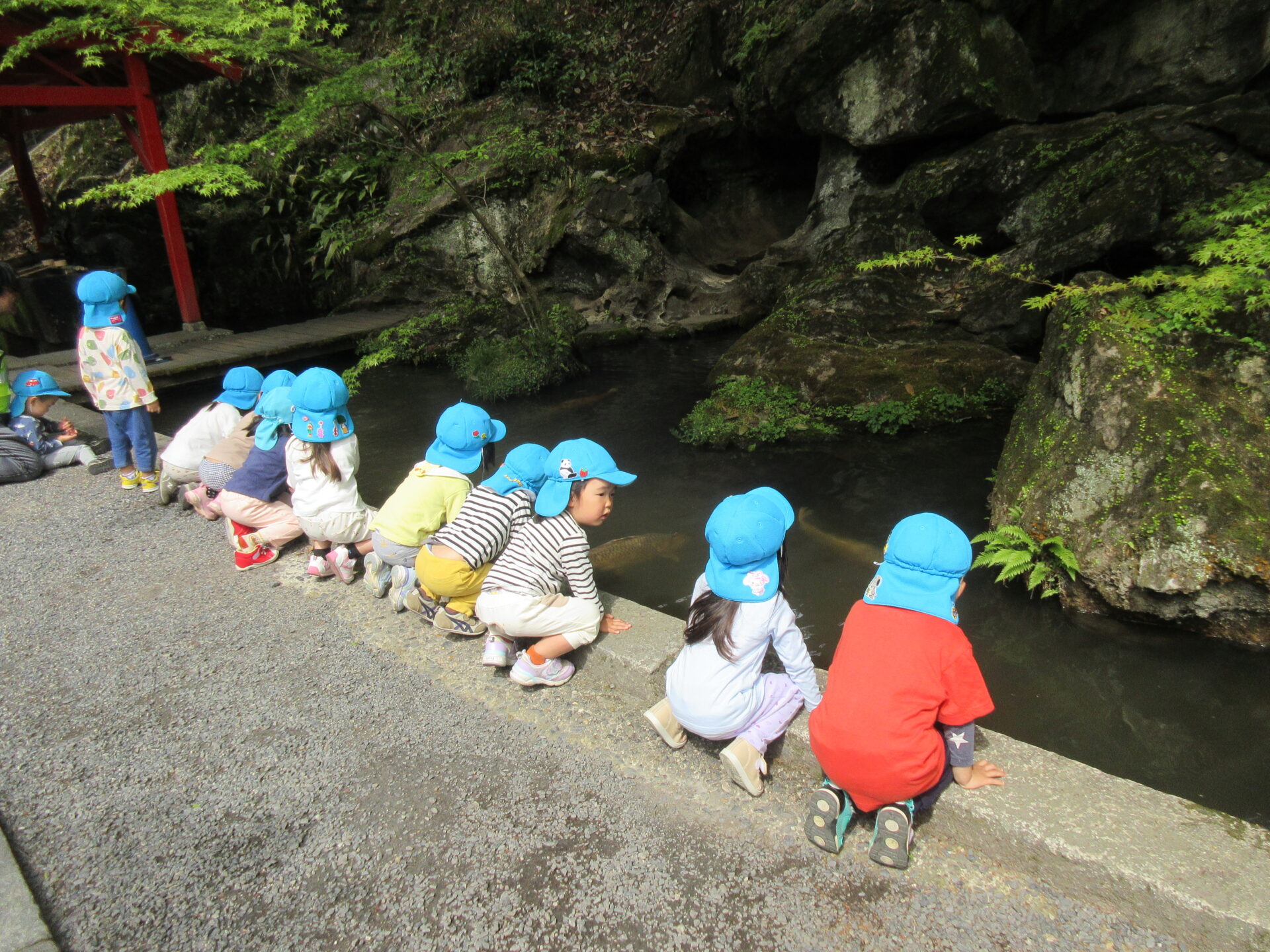 中に進んでいくと、「見つけた-!!」と池の鯉に釘付けの子どもたちです。