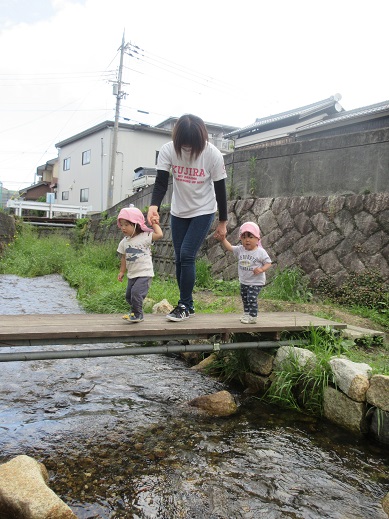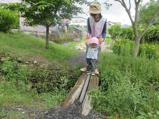 先生に手を引いてもらって、一本橋を渡ります。慎重に、慎重に・・・。