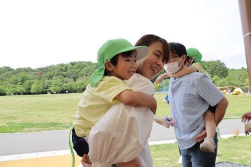 5歳児手作り三つ編みのしっぽを付けた子どもたちが、お家の方におんぶをしてもらい、クラス対抗でしっぽとりです。