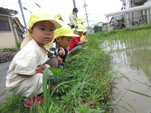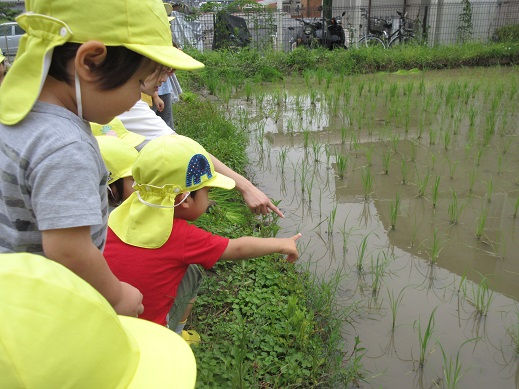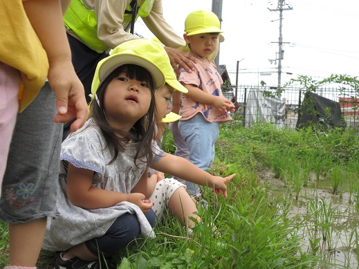 梅雨の合間の雨上がりに、保育園の近くの田んぼまでお散歩に行きました。
