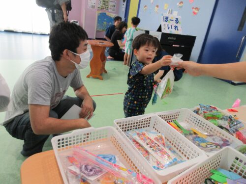 空くじなしのお菓子と、あたりが書いてあったお友だちには景品が、大当たりには幼児クラスのお友だちがが折ってくれた、折り紙がプレゼントされました。