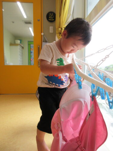 保育園は遊んで生活をする所です。遊びはもちろん!服を脱ぎ着したり自分で選んだり、生活の中でも考えたり、身体や手先を使う場面がいっぱいあります。1歳児さんでも、生活の中でできることが沢山あるんですね。