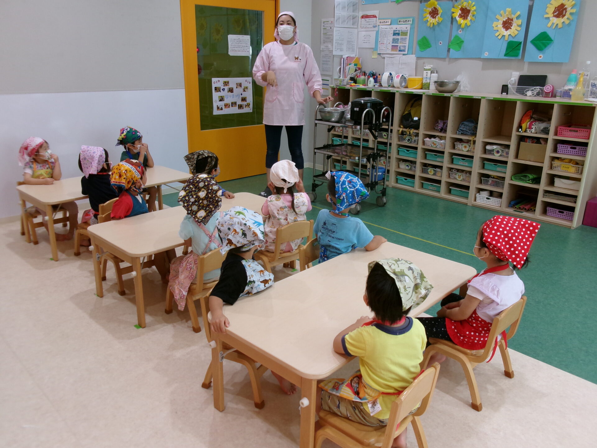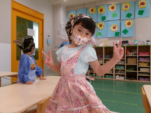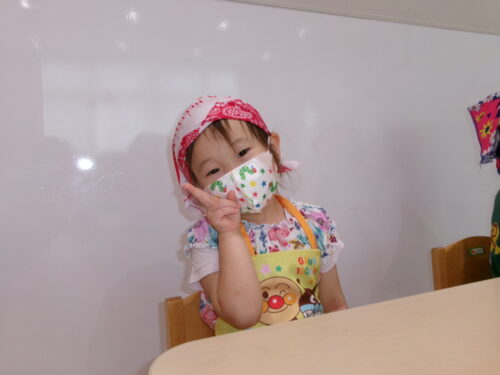 「エプロンとマスクと・・・?」【3歳児 にじチーム】