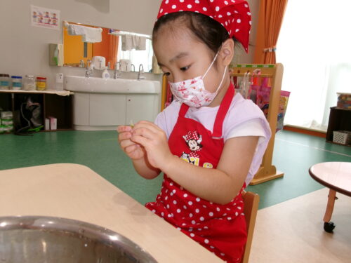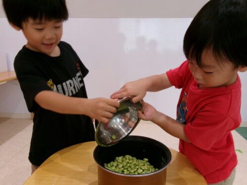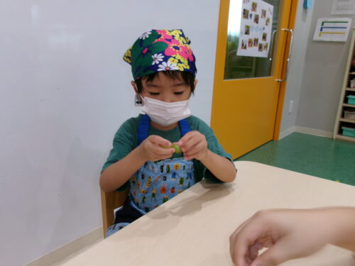 湯がいていないお豆は少々固めで「かた~い」「先生どうやってすんの?」と苦戦気味な子どもたちでしたが、半分に割ってからすることを伝えると、あちこちから「できた!」の声が聞こえてきました♪