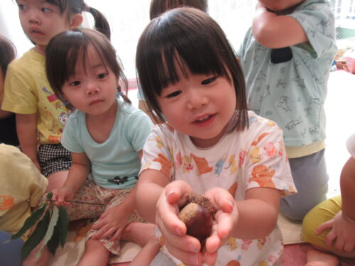 ひと足早く、保育者が用意した栗やどんぐりに触れてもらう機会をもちました。