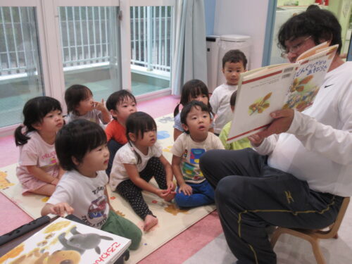 保育者が栗やどんぐりの絵本『ころわんのころころ』『どんぐりざかのあそびうた』を読んだ後、