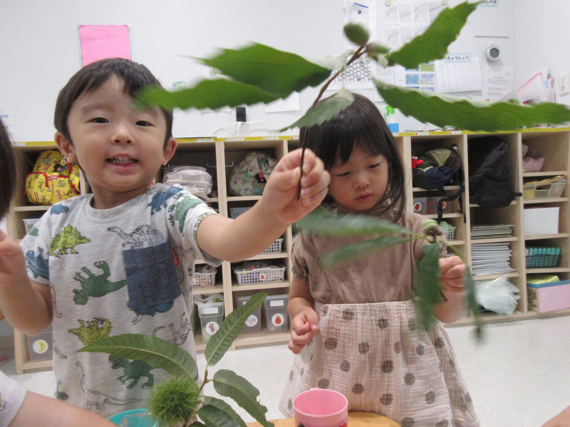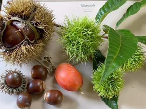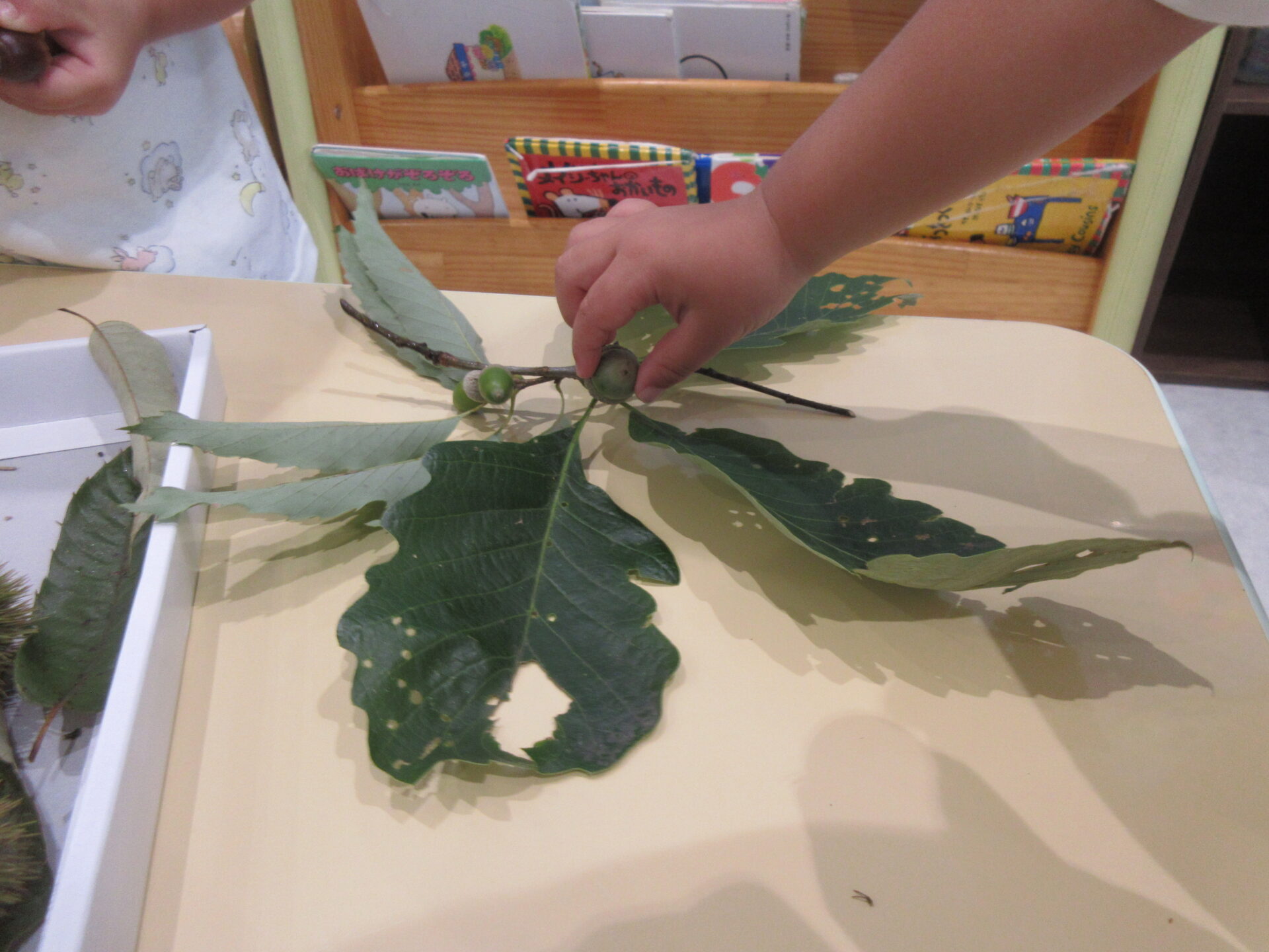いつも散歩に行く公園の中で、毎年一番早く落ちるクヌギ、農家の方から分けてもらった栽培種の栗に加えて、まだ青々してイガの開いていないヤマグリ(シバグリ)、コナラ、ナラガシワのどんぐりを子どもたちのところに持ってくると「栗や!」「どんぐりー!」と大喜び。