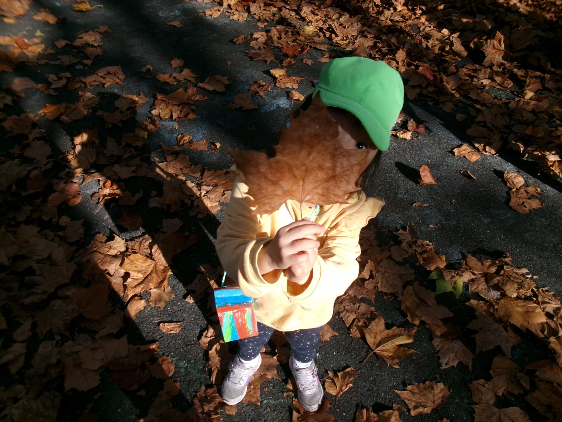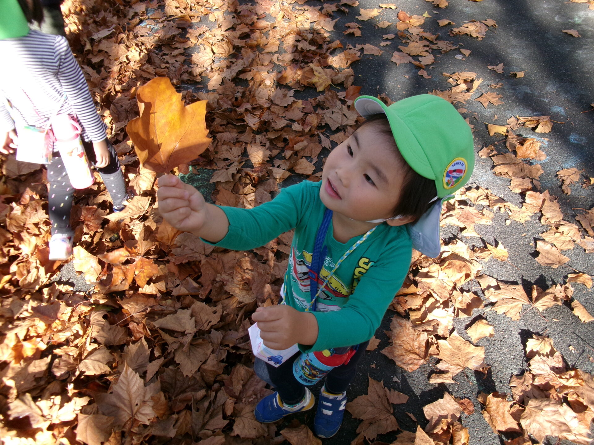 「こんな大きいの見つけた!」「こんな色のもある!」黄色や赤色、茶色のグラデーションの葉っぱを見つけて、とても嬉しそうに見せてくれました。