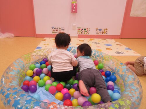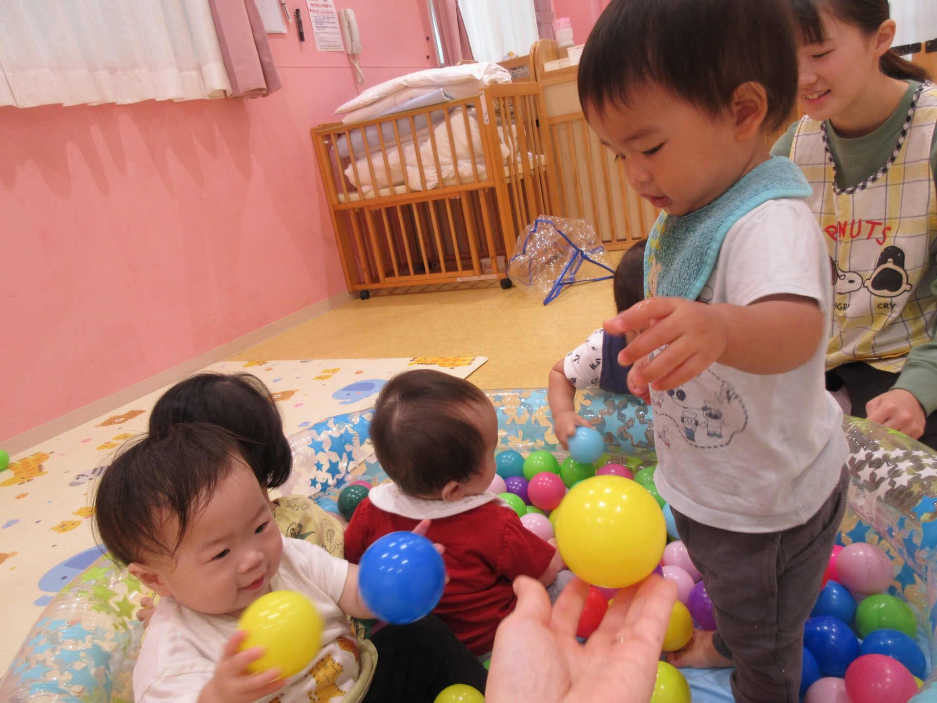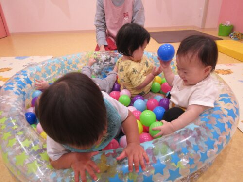 両手に持ったボールを叩き合わせたり、投げたりと、子どもによって遊び方は様々(*^-^*)