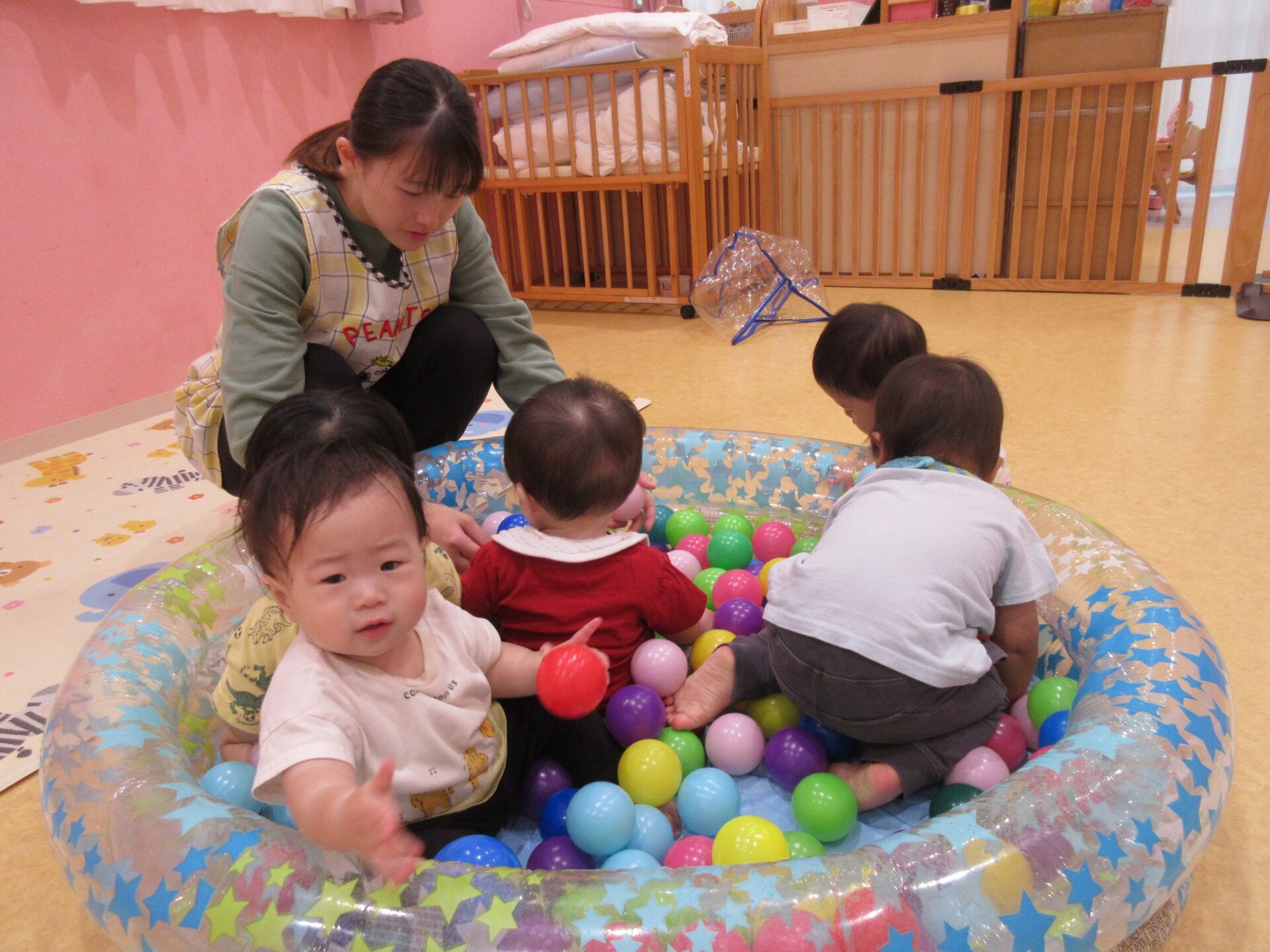 カラフルなボールを手に取って、秋のプールに大満足のうみさんでした。