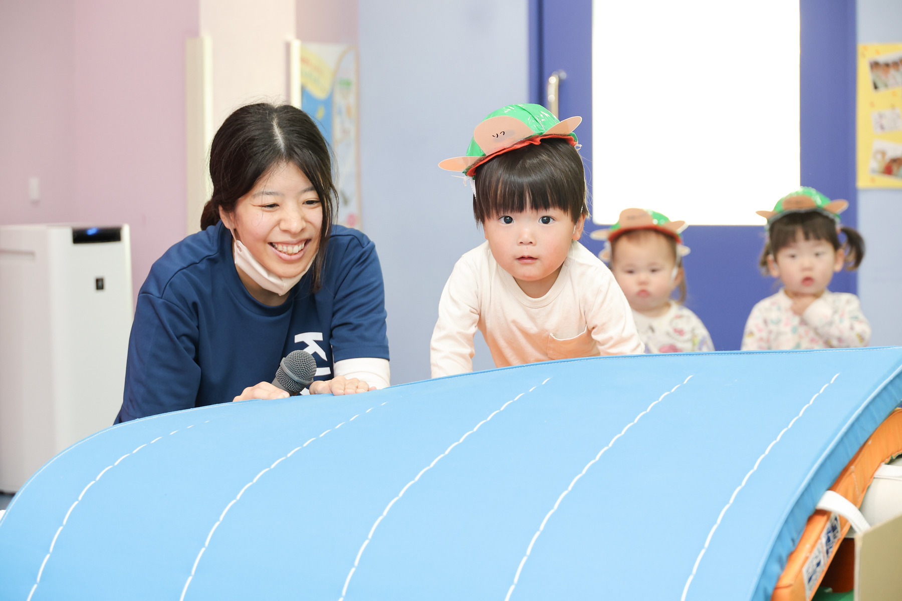 1歳児・だいちチームは、絵本『かめくんのさんぽ』『できるかな?あたまからつまさきまで』を題材に、運動遊びや体操をしました。