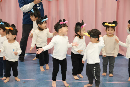 そして、運動会で踊った『ジャンボリーミッキ―』を、お部屋でもずっと楽しんでいた、あめチームさん。「発表会でも踊りたい!」と言う声もあり、今度はミニーちゃんのダンス『イッツベリーミニー』を踊ることにしたそう。お耳がとってもキュートです♡