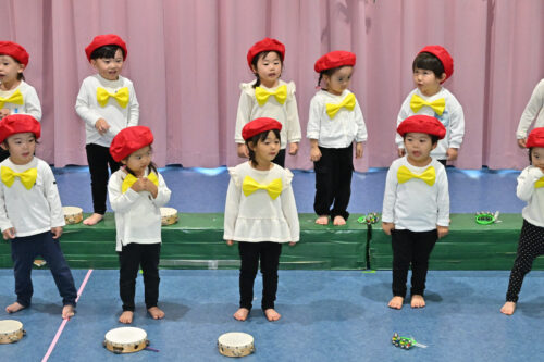 2歳児・あめチームさんは、お揃いの衣装に変身して、お歌と合奏♪