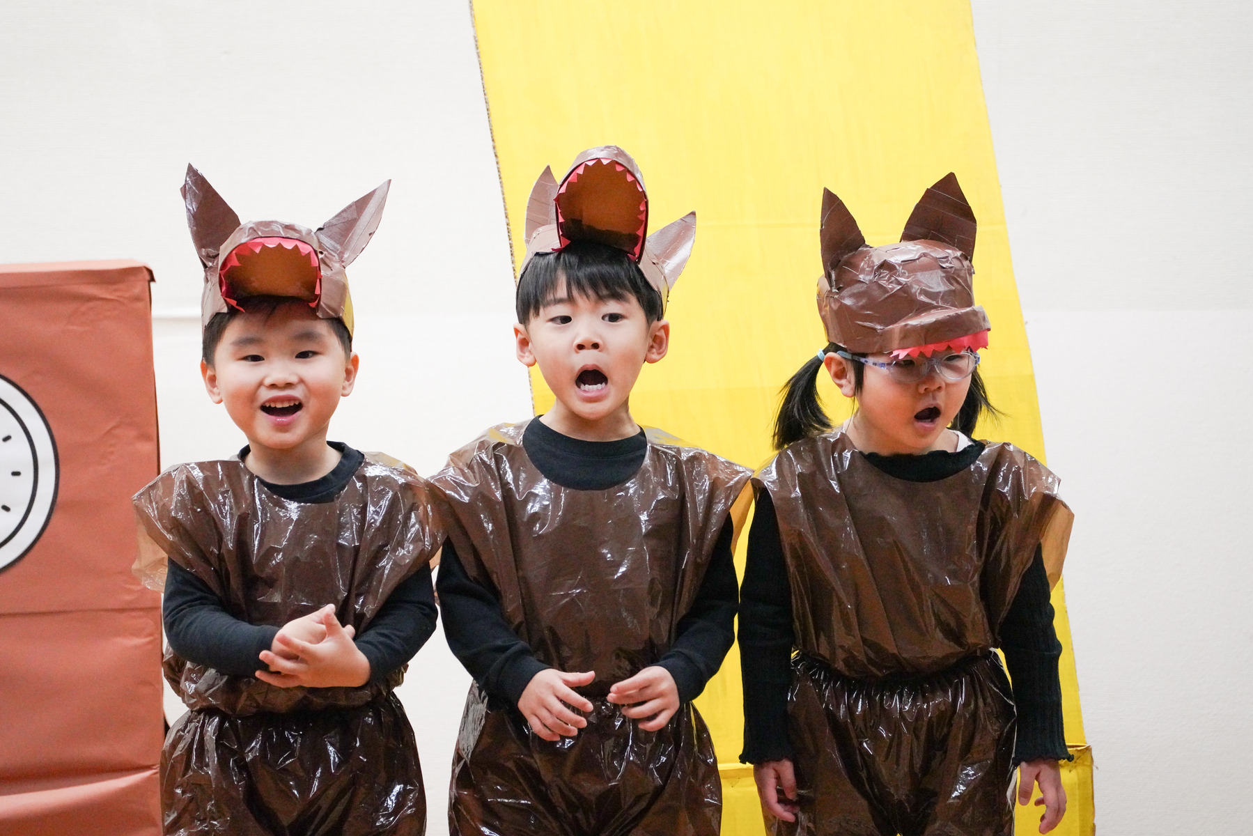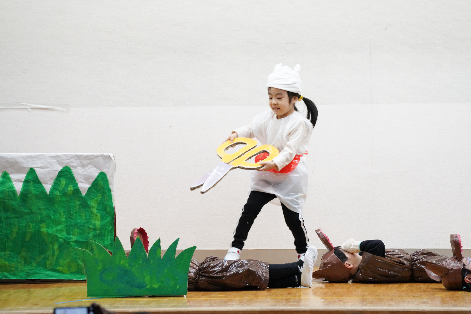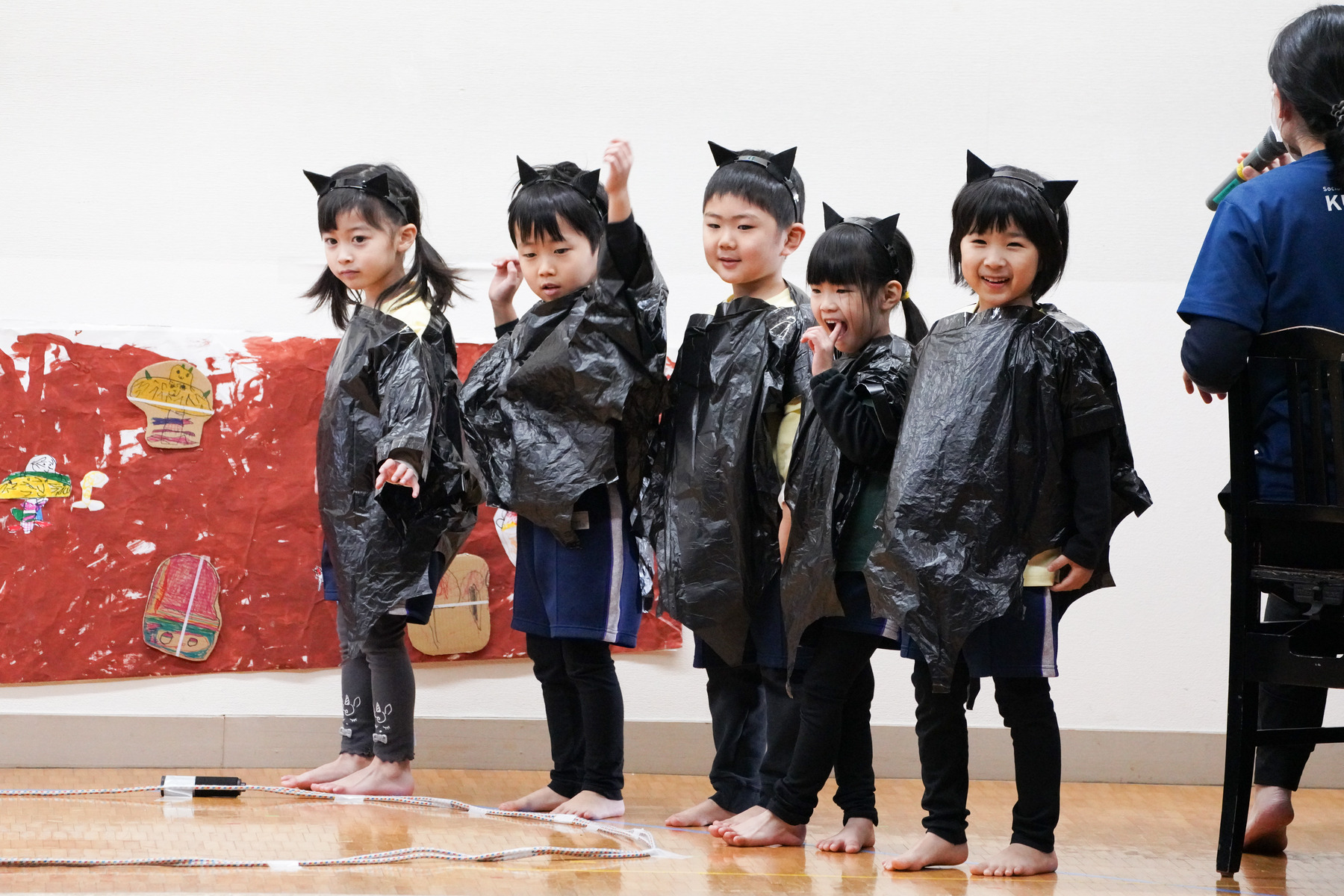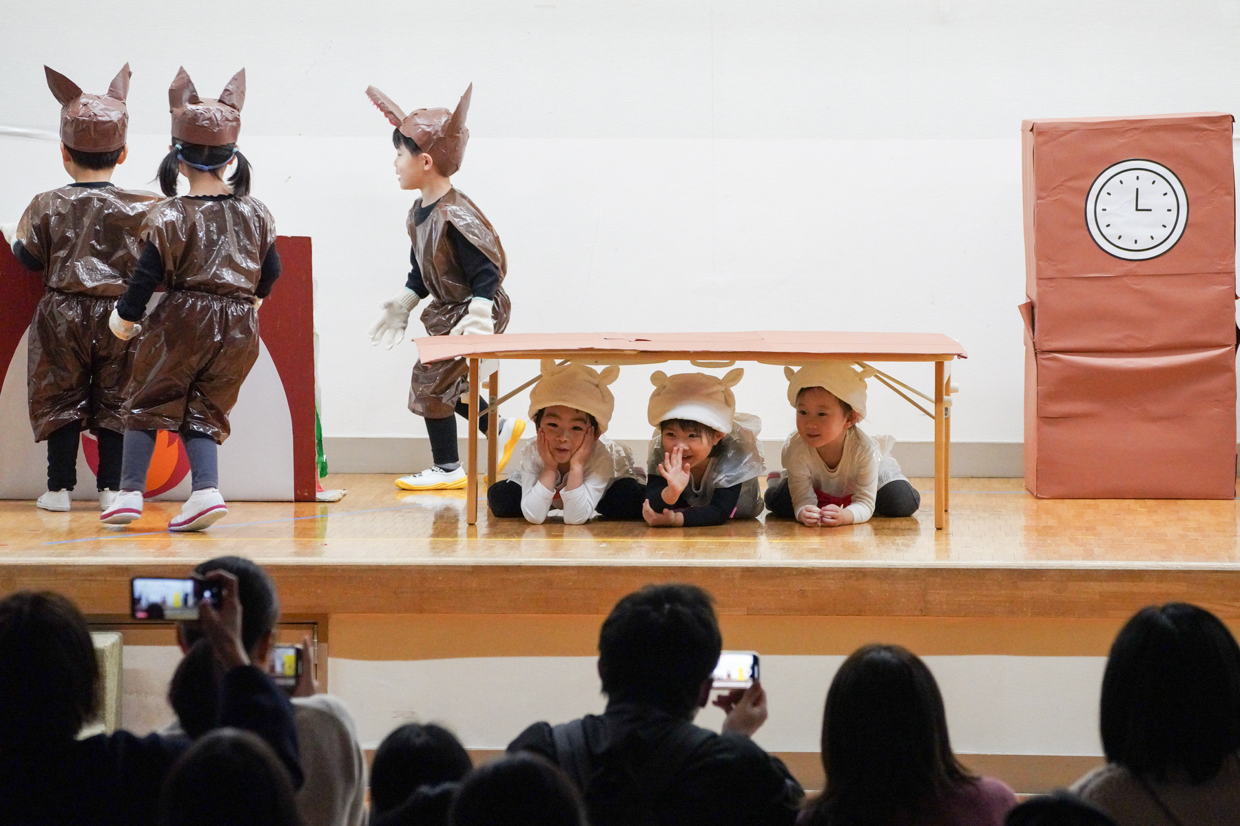 劇あそびを始めたころは、なかなかセリフが出てこない事もありましたが、みんなで取り組んでいくうちに、どんどん楽しくなってきて、それぞれの役になりきって表現してくれました。