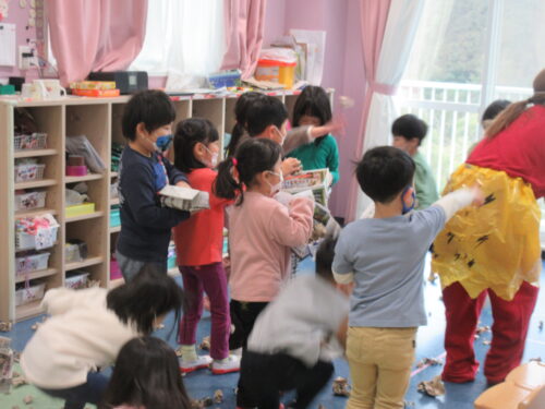 担任に「早く豆ちょうだい!来ちゃう来ちゃうー💦」と、大急ぎで豆を用意する子どもたち。
