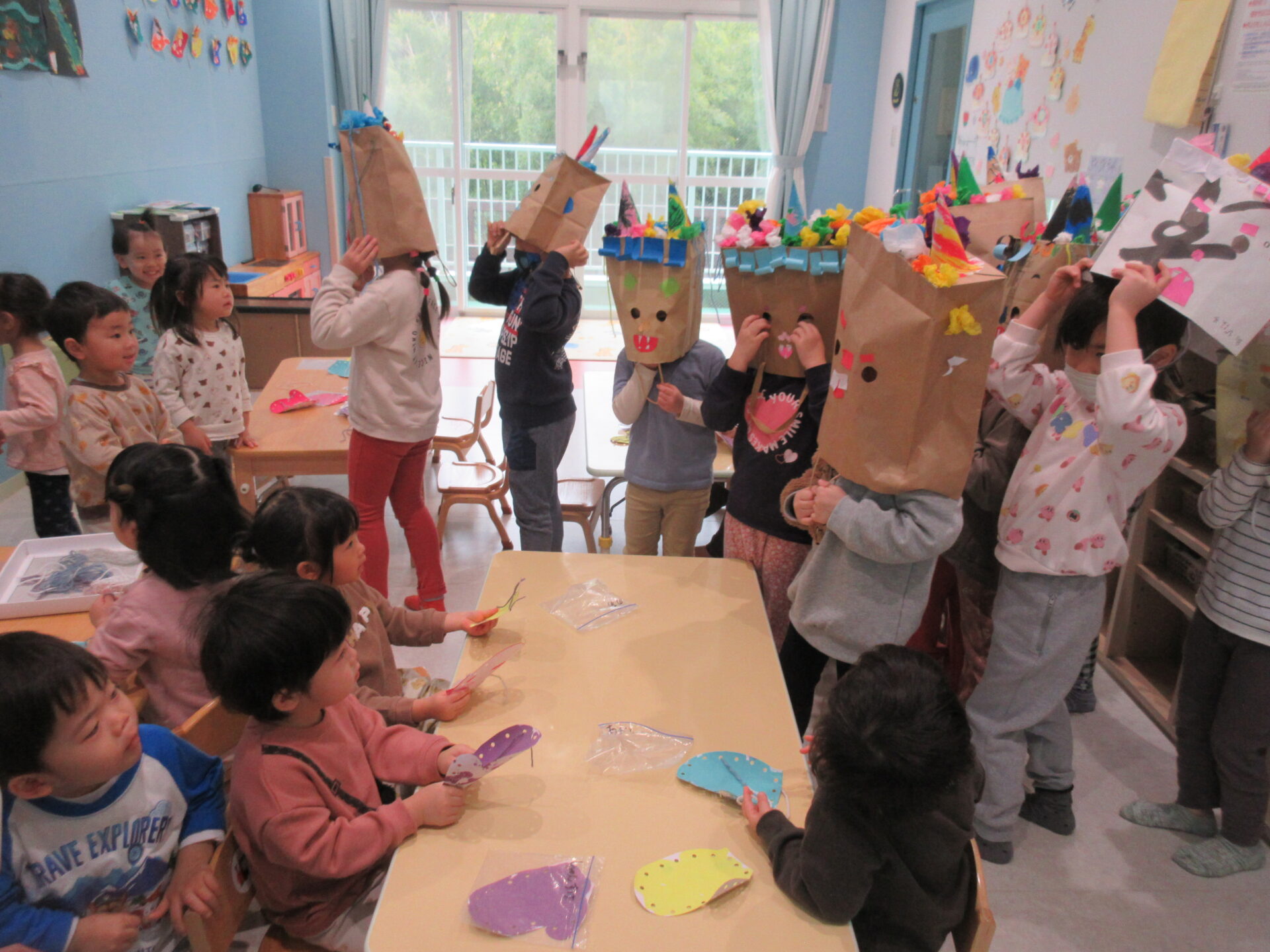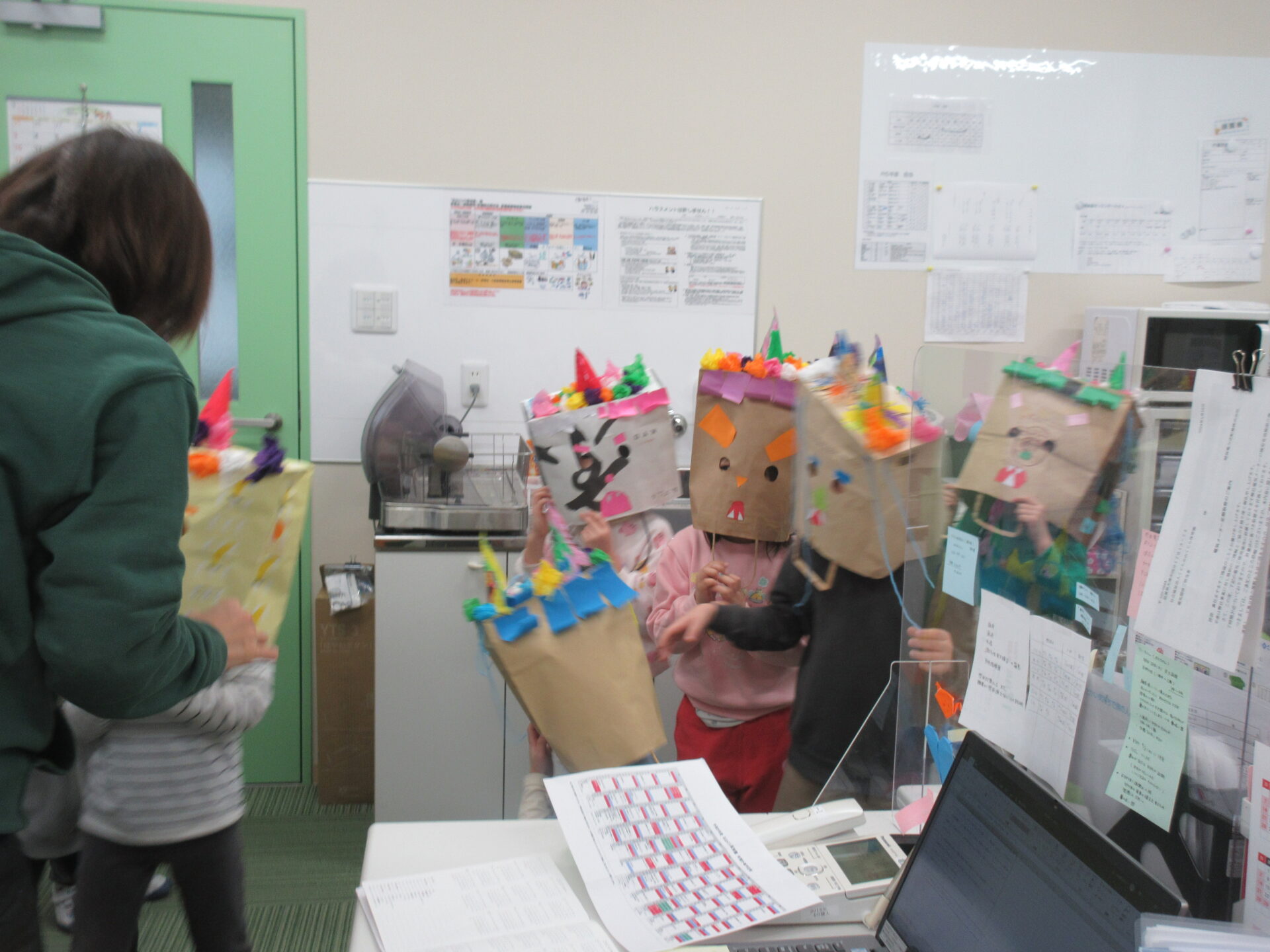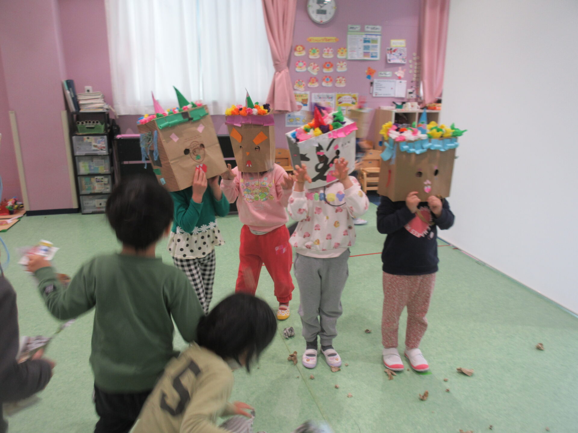 ロールカーテンを開けて「鬼だぞー!」と、怒りんぼ鬼やブロッコリー食べない鬼、泣き虫鬼などなど、いろんな鬼の登場です!
