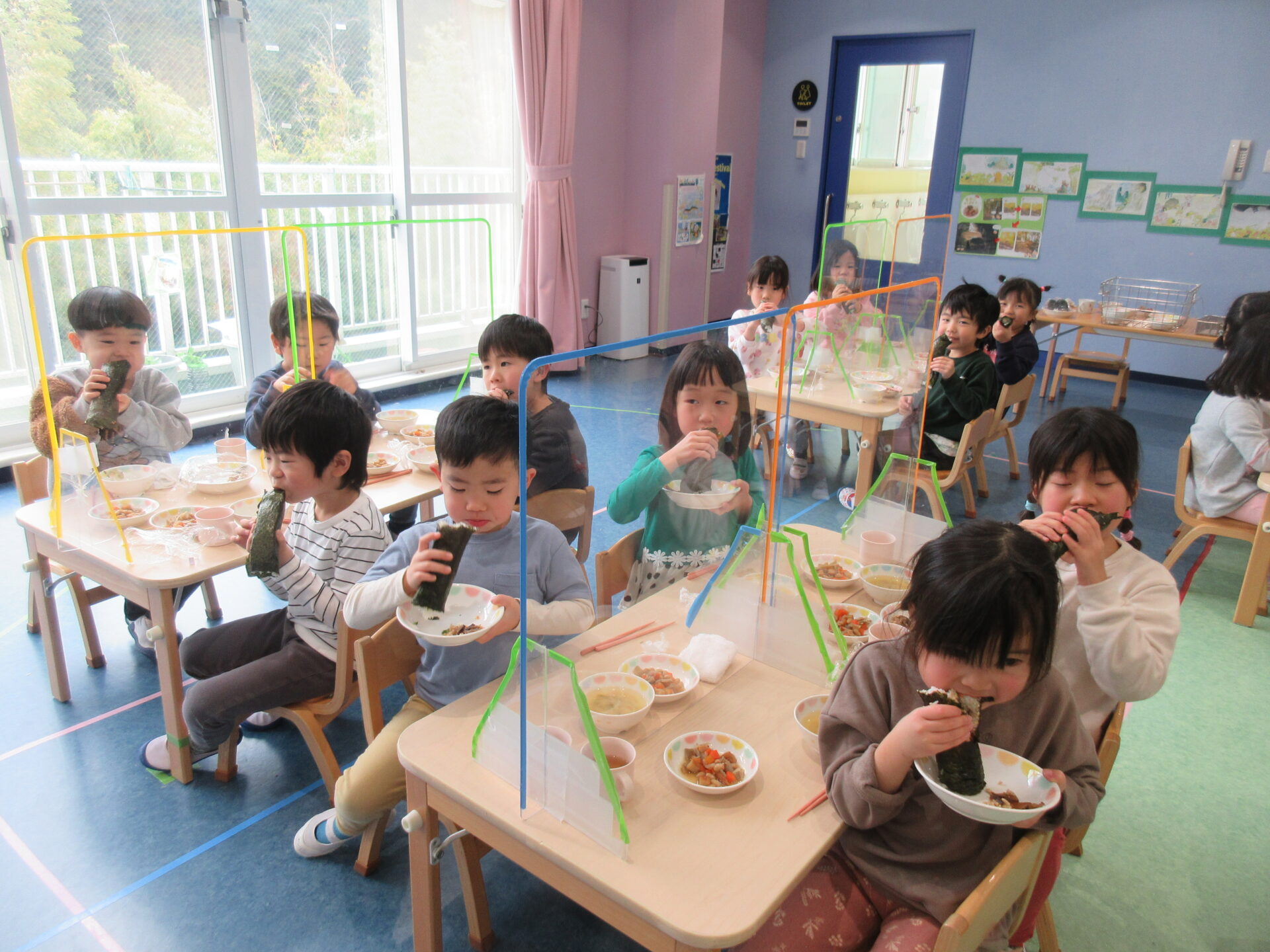 『食べている途中に喋ると、せっかく巻いた福が逃げてしまう』ということで、恵方巻を食べ出すと無言になる子どもたち。