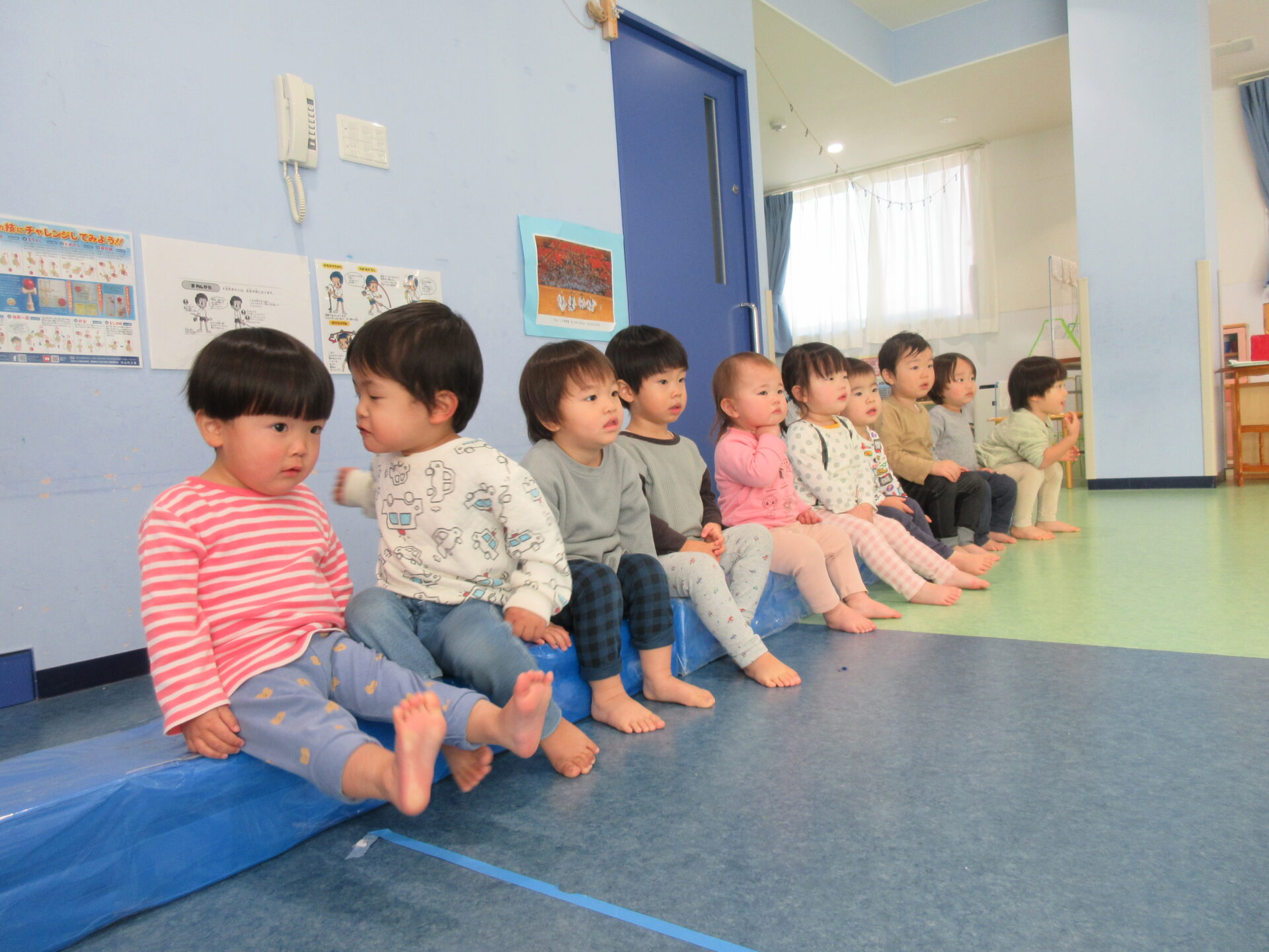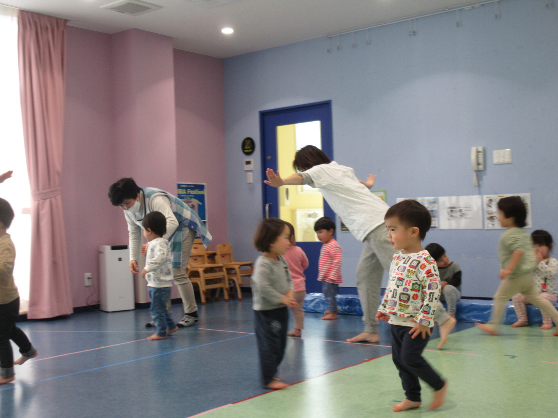 1歳児だいちチーム・2歳児あめチームで、初めて一緒にリズムをしました♪