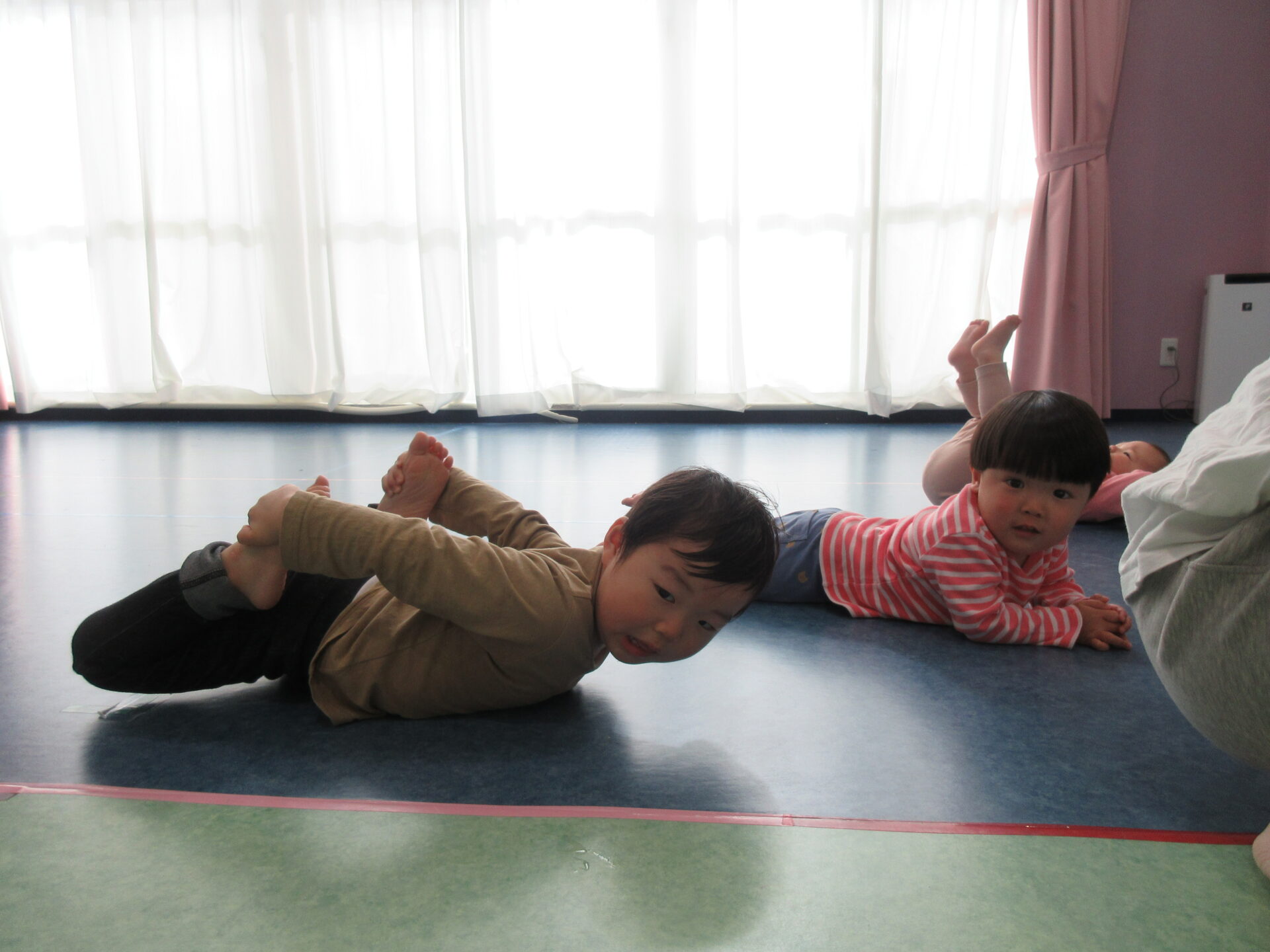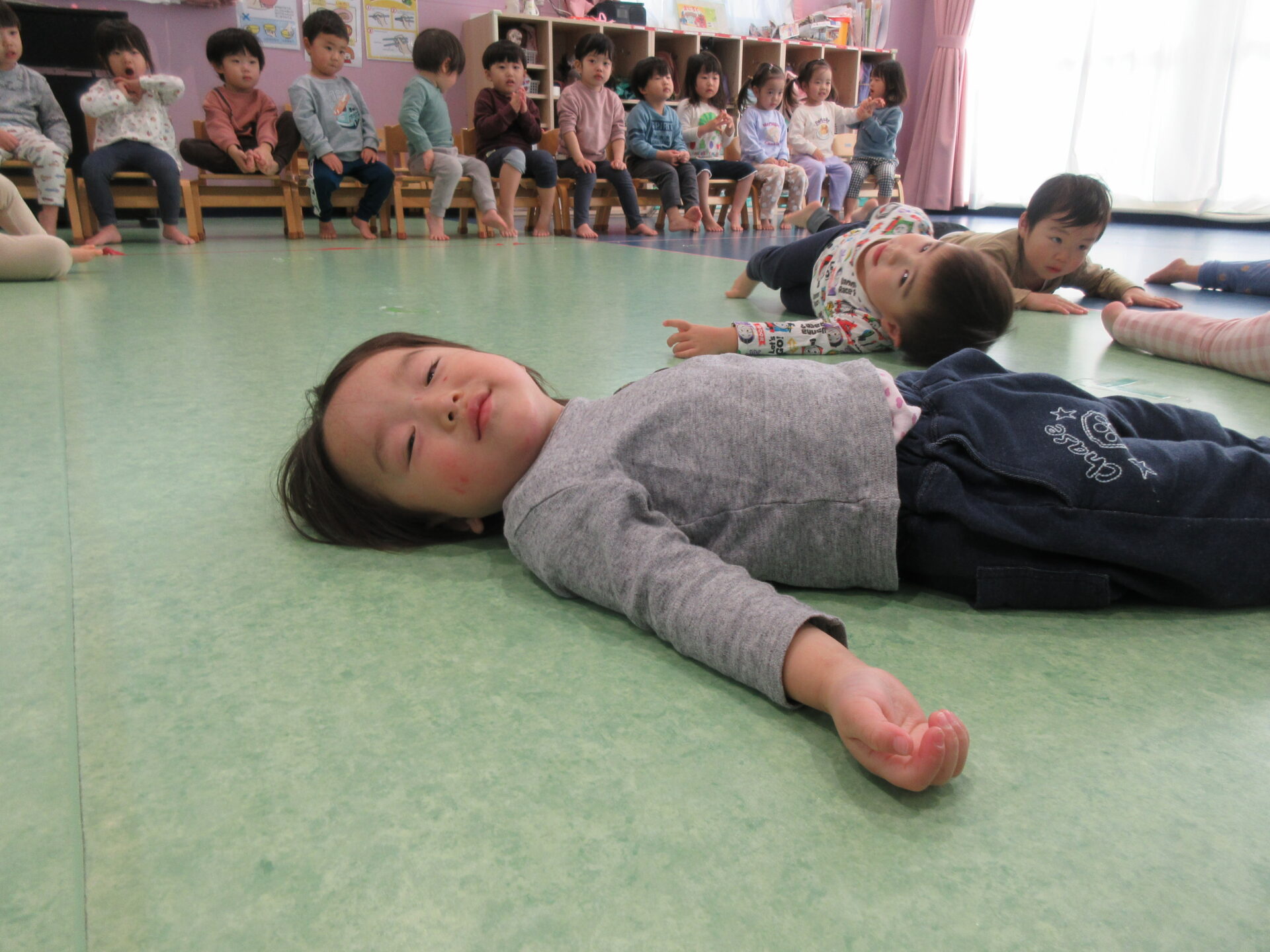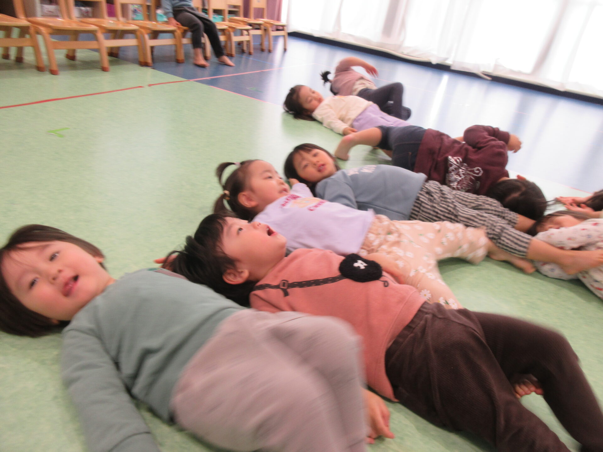だいちさん・あめさんではまだまだ真似っこですが、幼児さんに上がると、体の力を入れたり抜いたりする事も、自分自身の体を知りながらコントロール出来るようになっていきます。とっても気持ちよさそうですね。