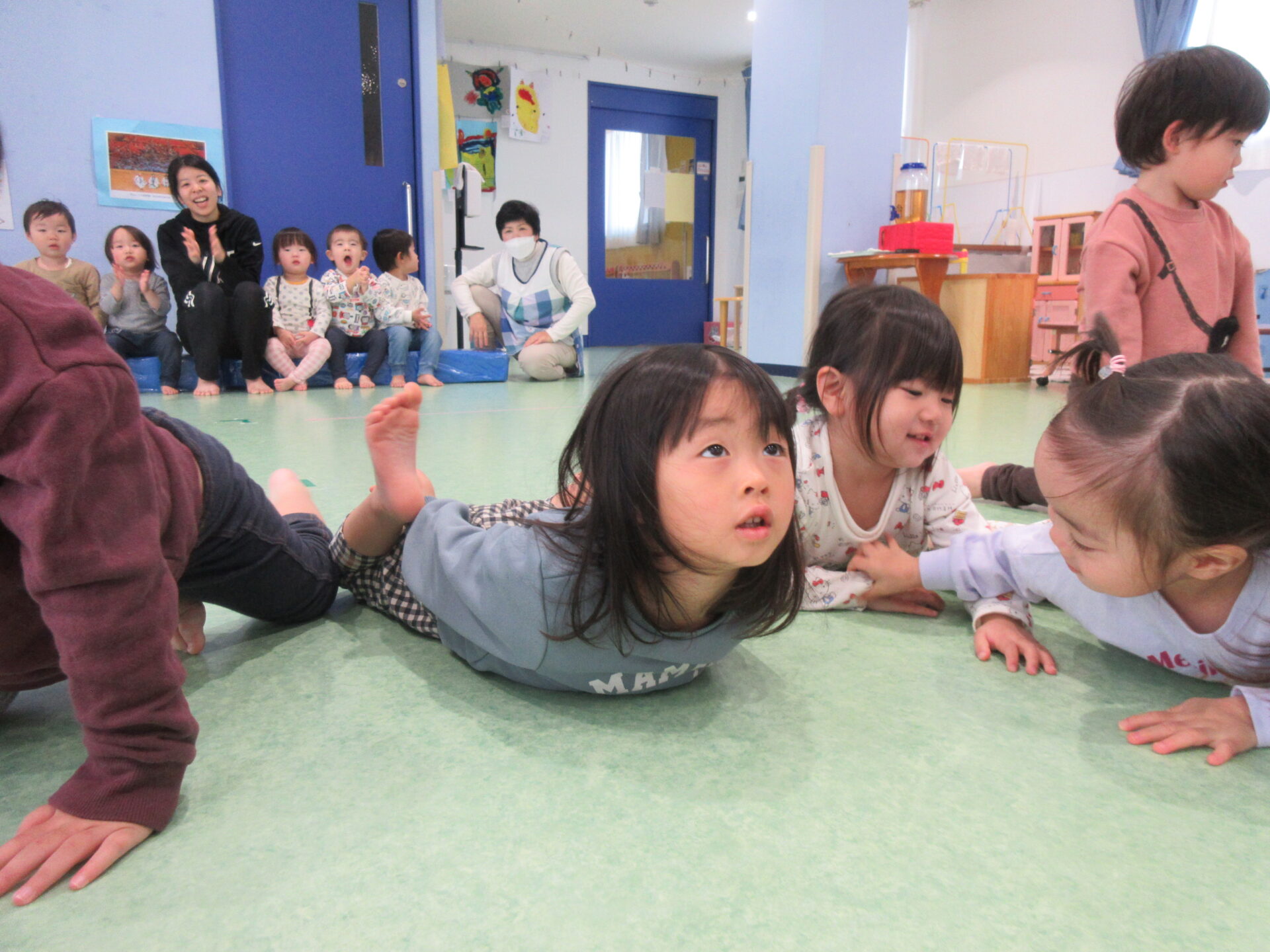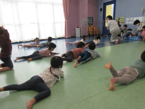 ワニになって、ずり這いをしますよ。この動きが全身運動でとってもハード!!赤ちゃんの時代にずり這い運動をよくしていたと思います。何気にやっているように見えるのですが、実は大変な全身運動なんですよ。