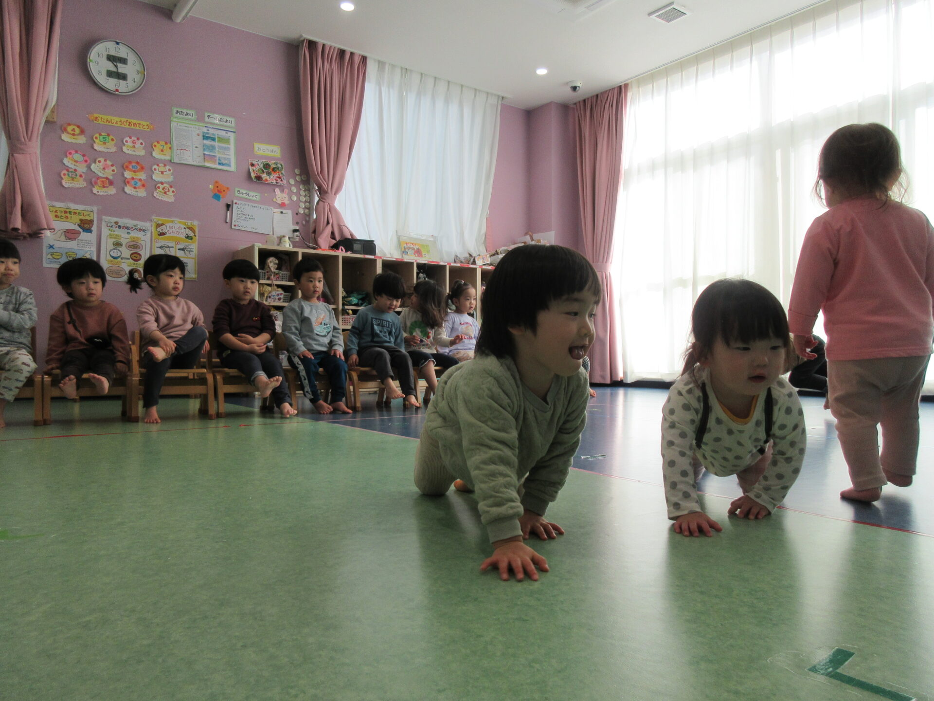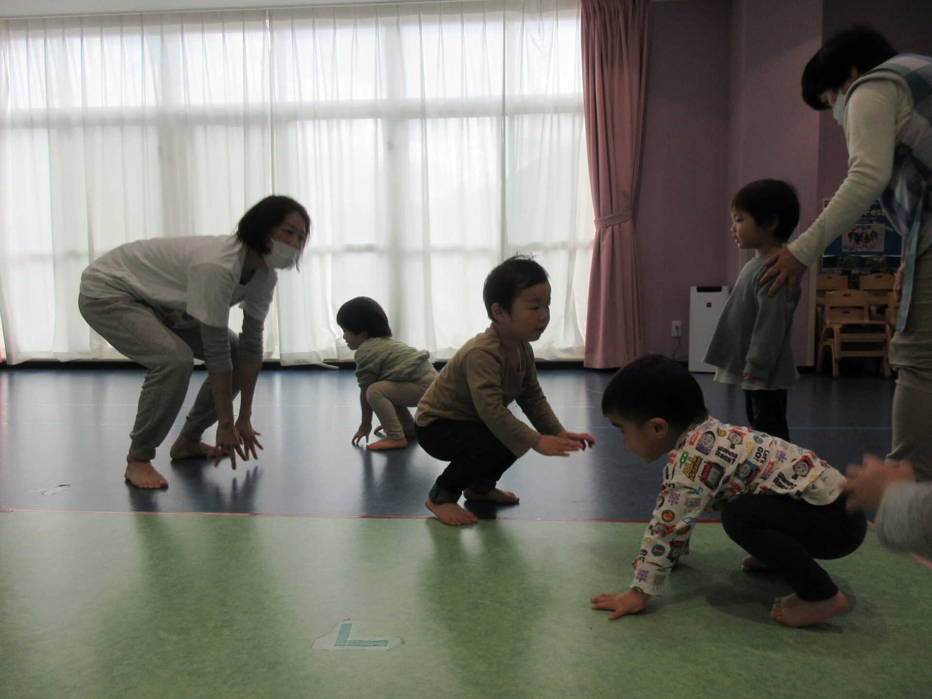 馬のリズムでは、手をしっかり開き、足の指をついて、馬のように四つ足ハイハイをします。
