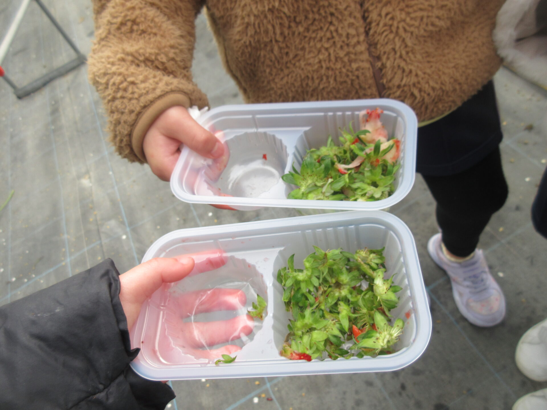 えっ、そんなに食べたの?と思いますが、このカップにいっぱいヘタを入れ、一度ごみ箱に捨ててもう一度ヘタの山を作っていたお友だちもいるので、もしかすると本当に100個ぐらい食べているのかもしれませんね。