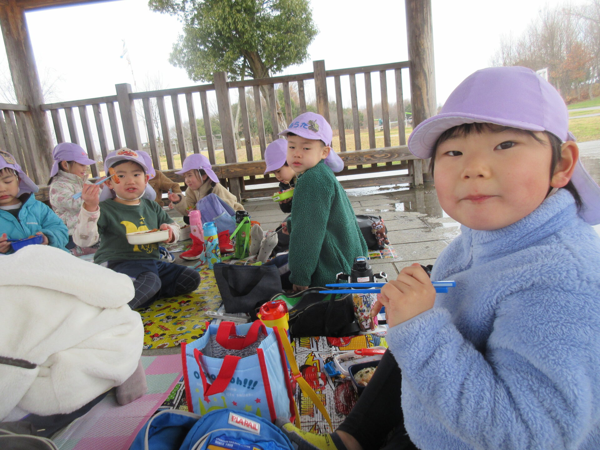 お弁当を食べながら、せめて雨が止んで鬼ごっこだけでもできたらいいなぁ…と思っていると