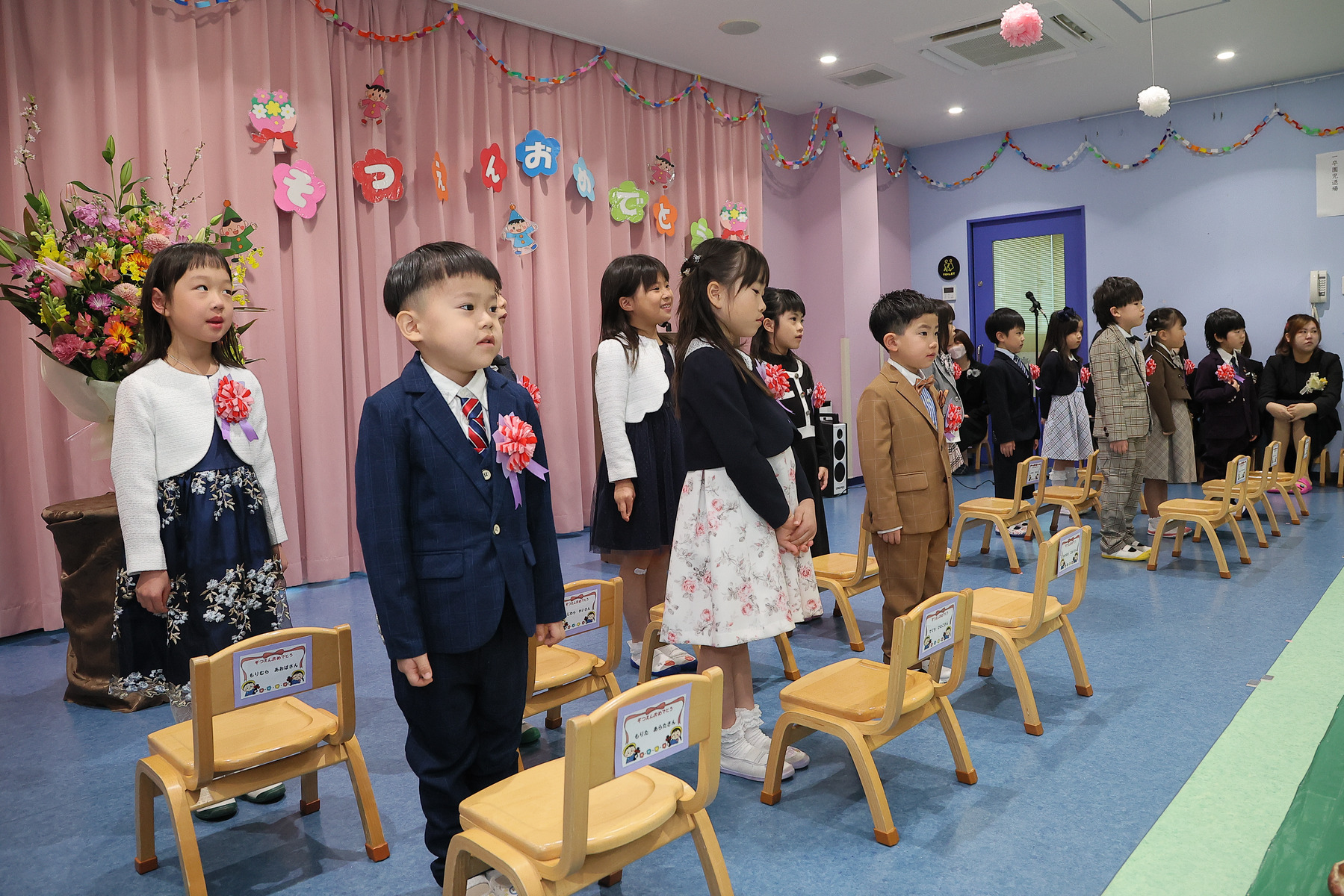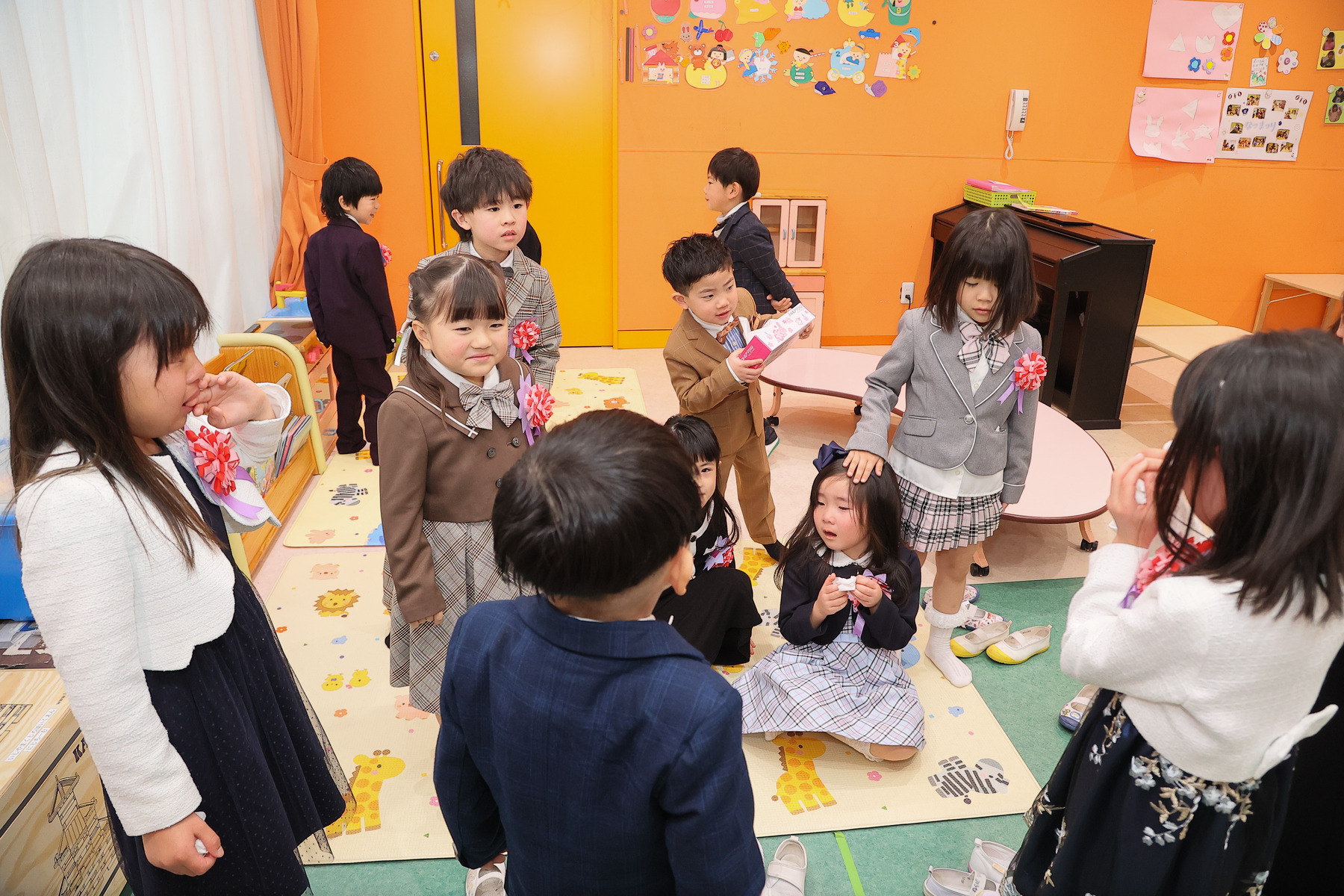 3月23日土曜日、いつもとは違う、より一層素敵な洋服に包まれ、お家の人と恥ずかしそうに保育園にやって来た、くじらチームの子どもたち。