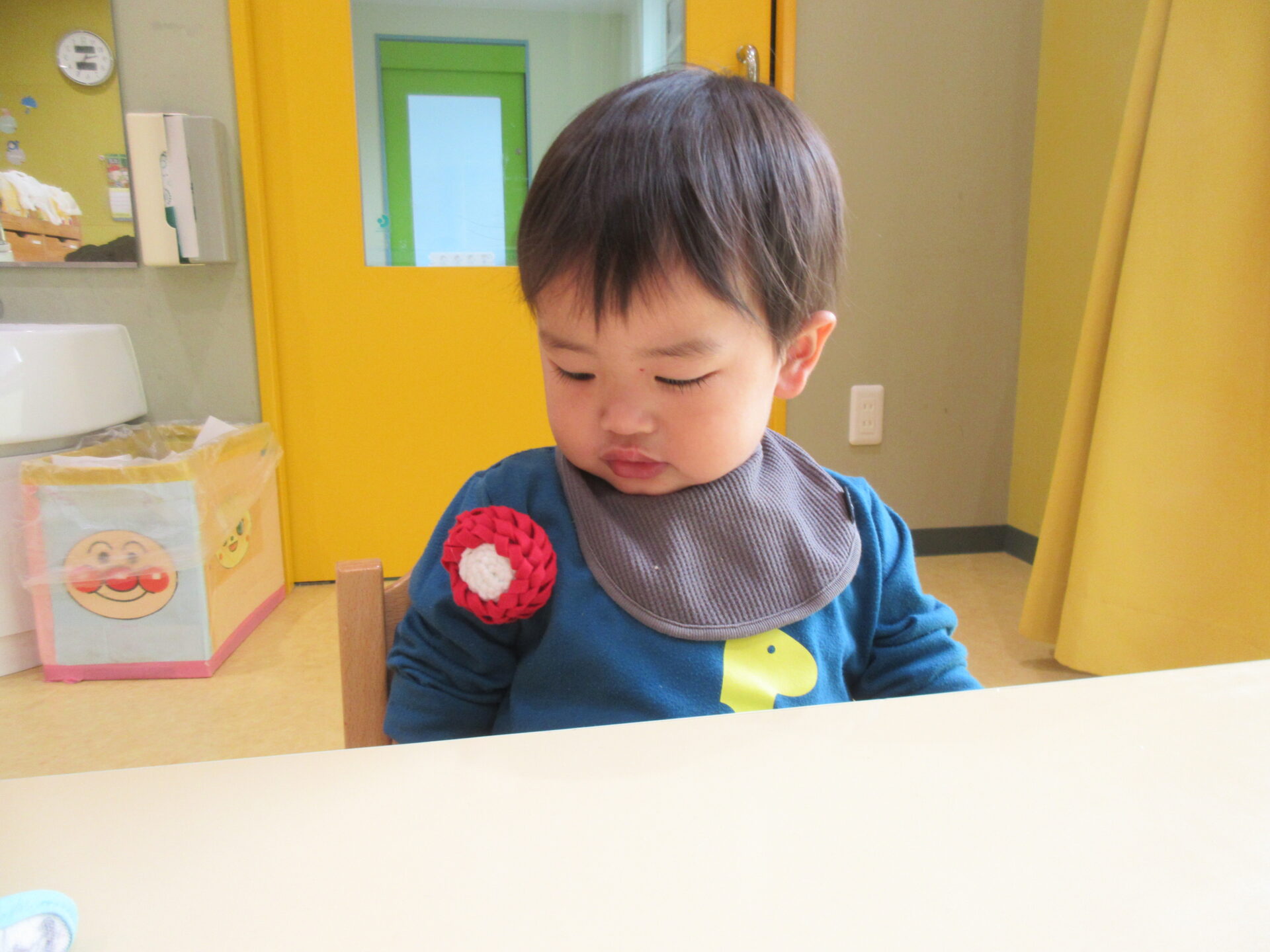 年に一度の、大切なその日にお祝いをしてあげたい…という職員の思いから、今年度は一人ひとりの誕生日に、手作りのお花を付けてもらう事になりました。