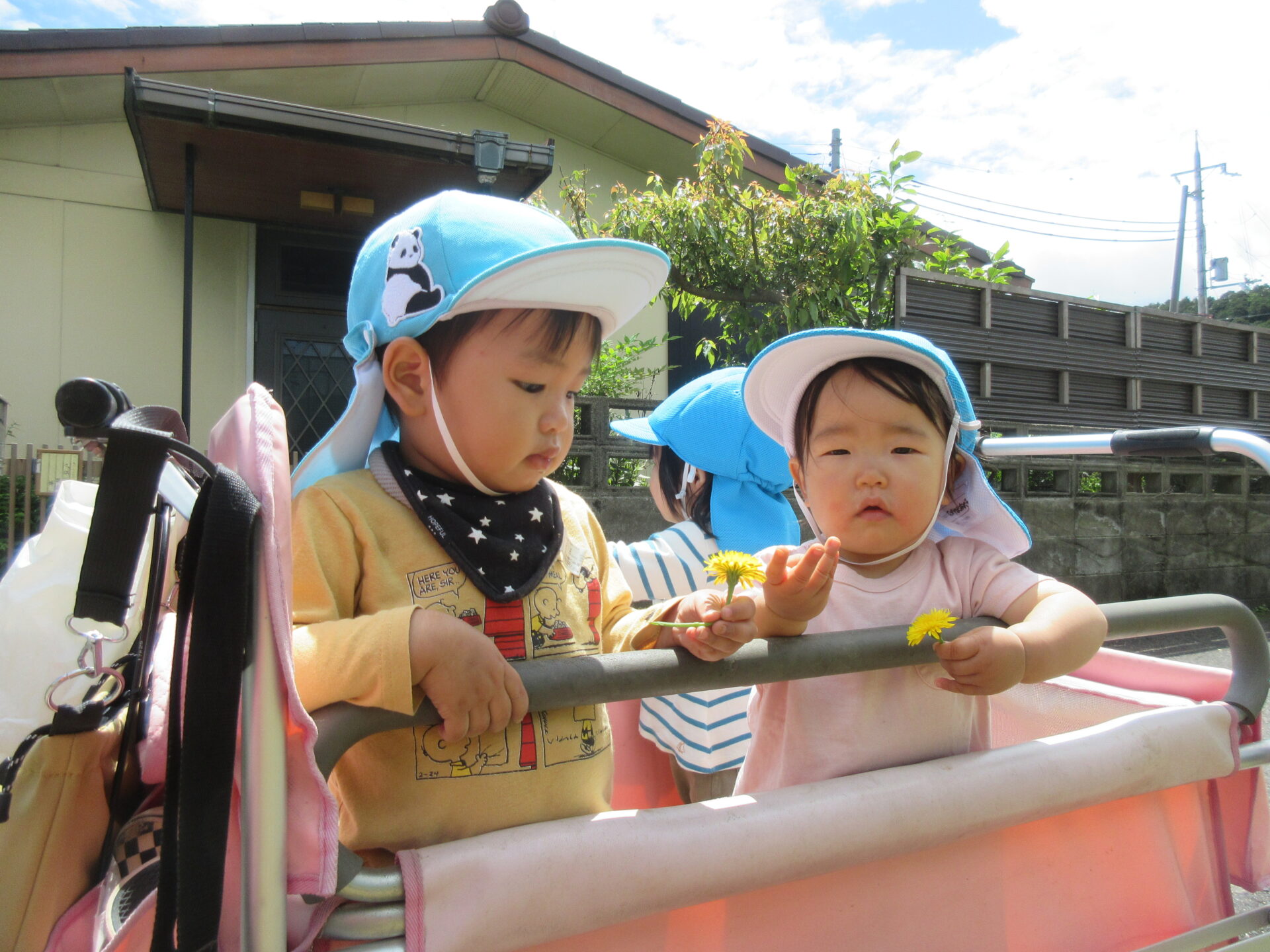 お天気の良い日は、保育園から10分・20分くらいの公園までお散歩カーに乗って遊びに行ったり、途中、高速道路や新幹線が見える道を、お友だちと手を繋いで歩いたり。
