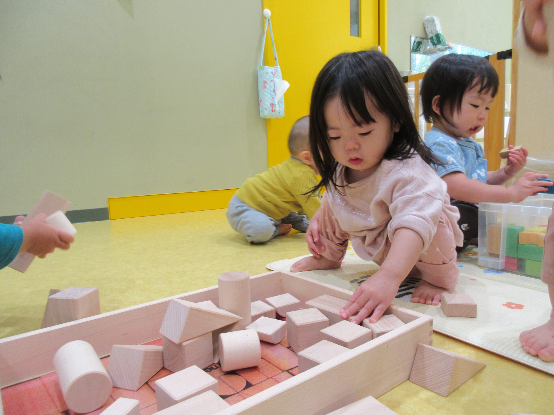 朝。お家の方と離れる際には、まだまだ泣いてしまう事だってありますが、保育者のお膝に座ってちょっと落ち着くと、好きな遊びがスタート。