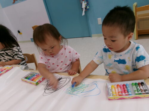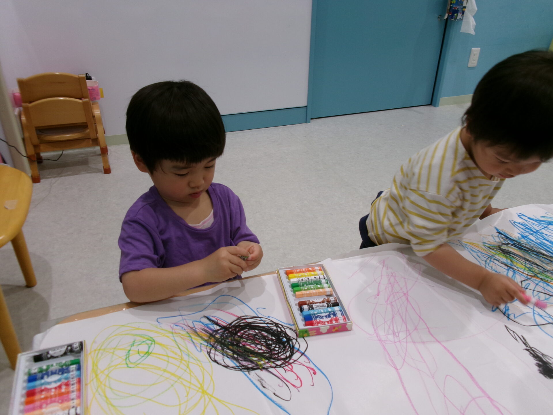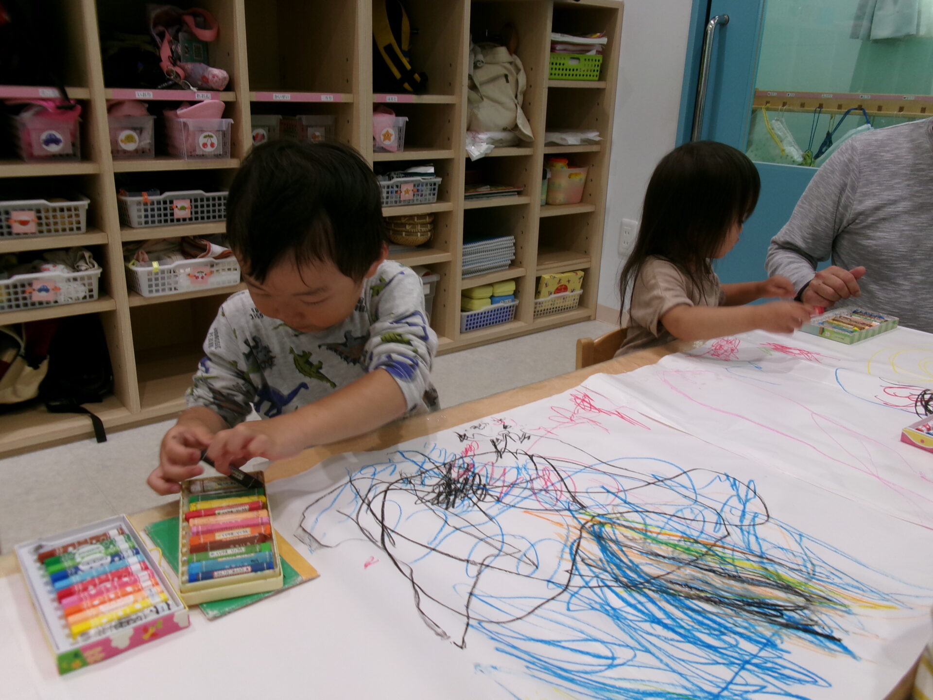 2歳児クラスになってクレパスが個人持ちになったことが嬉しくて、「ぼくのクレパス」「私のクレパス」と、なかなか描き出そうとしなかった子どもたちでしたが・・・