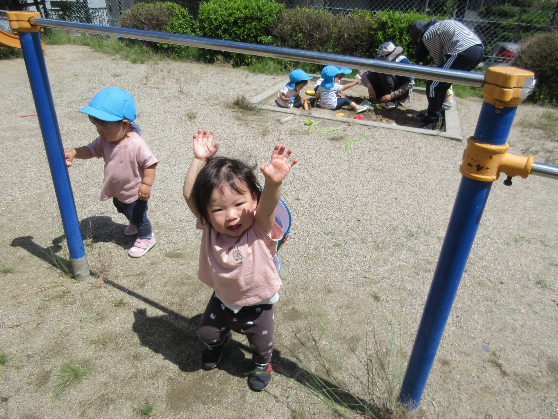 食べ終わった後は、靴を履いて滑り台や砂場、鉄棒へ・・・