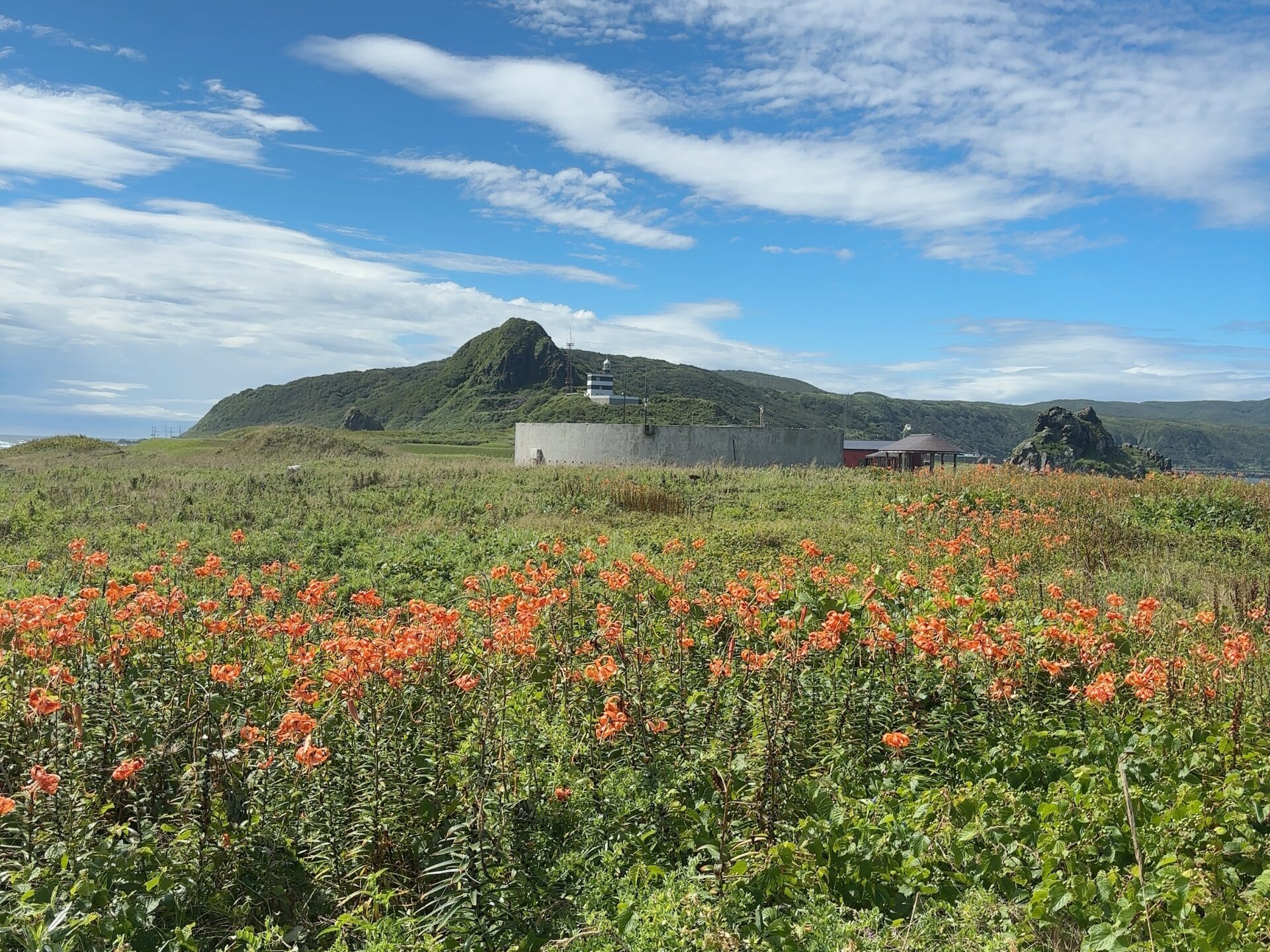 灯台があって、石がいっぱい積みあがっています。ハマナスの花も咲いていました。